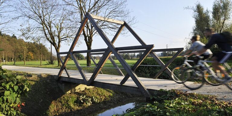 Arhitekti so zasnovali tri različne brvi za pešce in kolesarje iz lepljenega macesnovega lesa na Poti spominov in tovarištva. Vse tri konstrukcijske oblike zagotavljajo trajnost,