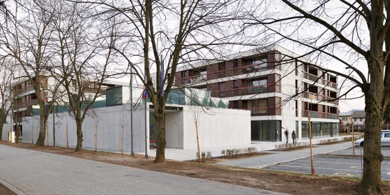 VRTEC MIŠKOLIN, ENOTA ZAJČJA DOBRAVA 2, LJUBLJANA Koncept Dvooddelčni vrtec stoji v zelenici ob robu nove stanovanjske soseske. Intenzivna pozidanost okolice je narekovala zasnovo zaprtega
