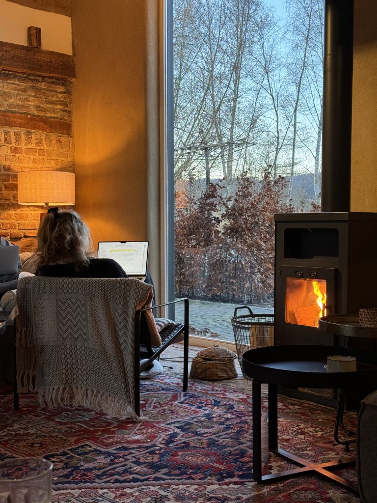 To pišem na peti dan pisateljskega umika na jugu Nizozemske. Sedim ob kaminu in tipkam. Kavč je mehek in širok, pokrita sem z odejo. Iz