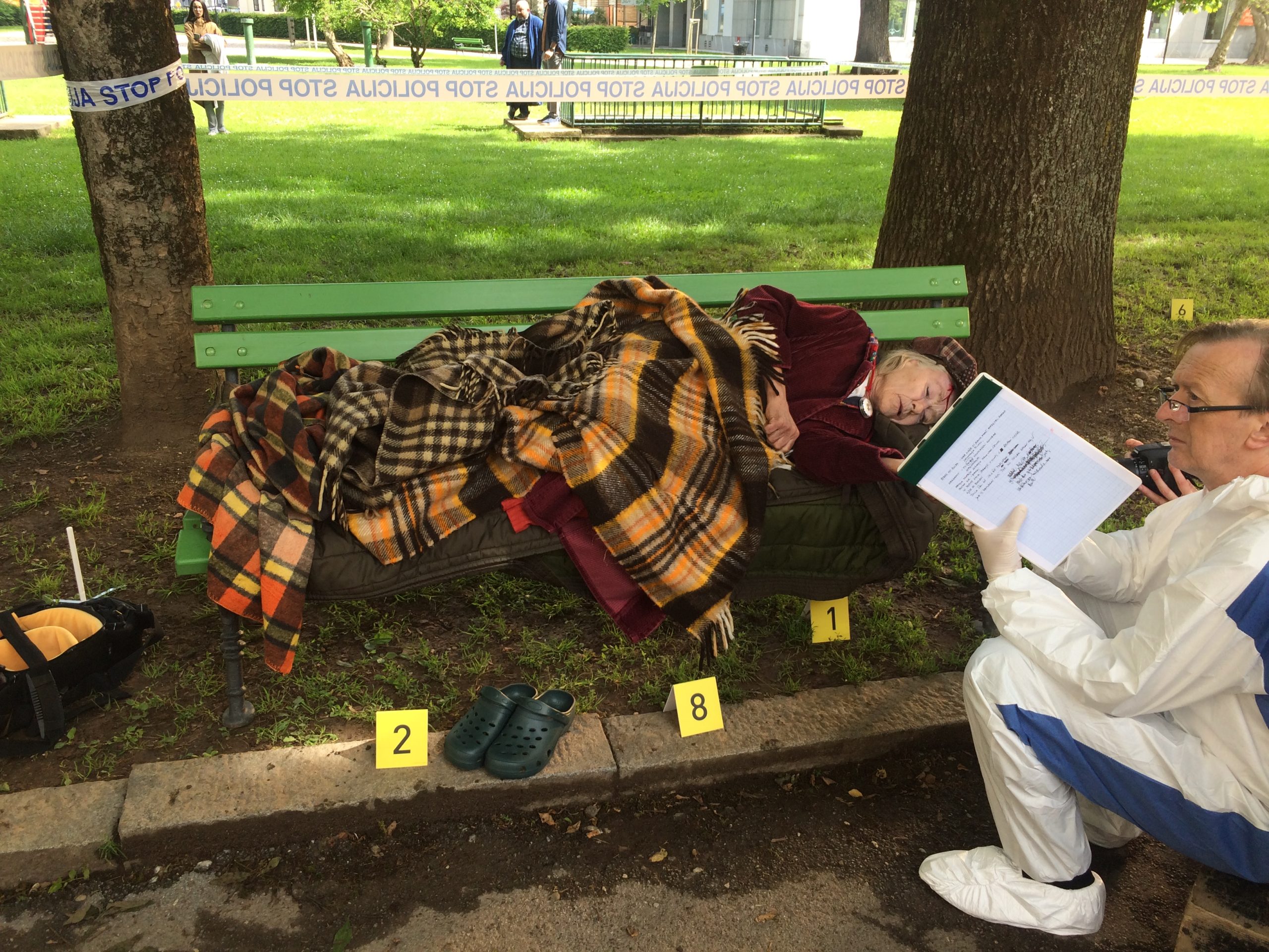 Zaradi filmske geografije, da gledalec razume, kje v prostoru smo, je bilo edino logično, da se za vse prihode igralcev do mesta prvega zločina uporabijo ulice ob parku, na primer prenovljena Slovenska cesta, Štefanova ulica, Župančičeva ulica, ploščad pri Metalki. Ta del mesta zaznamujejo osupljive stavbe, je pa tudi eden redkih delov Ljubljane, kjer se s kontroliranim pogledom kamere lahko ustvari vtis velemesta. Druge zunanje lokacije smo smiselno nanizali v bogat urbani kolaž, od pisane, razsute Metelkove, ki je tudi realna lokacija po literarni predlogi, do betonskega industrijskega brutalizma hrbtne strani tiskarne časopisa Delo in vzvišenega pogleda čez mesto z vrha najvišje stavbe v Ljubljani. Želeli smo ustvariti občutek nasičenosti in vročine pripekajočega poletja v Ljubljani.