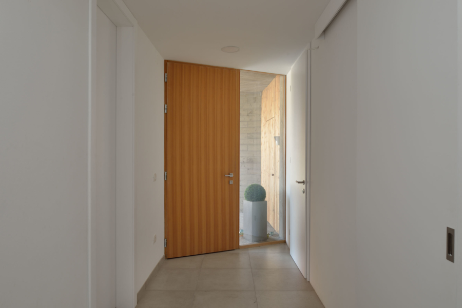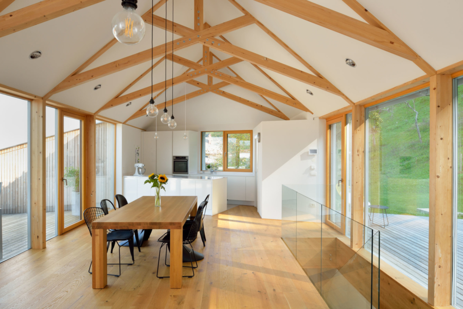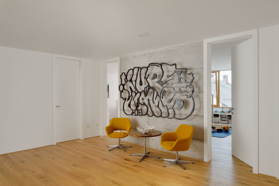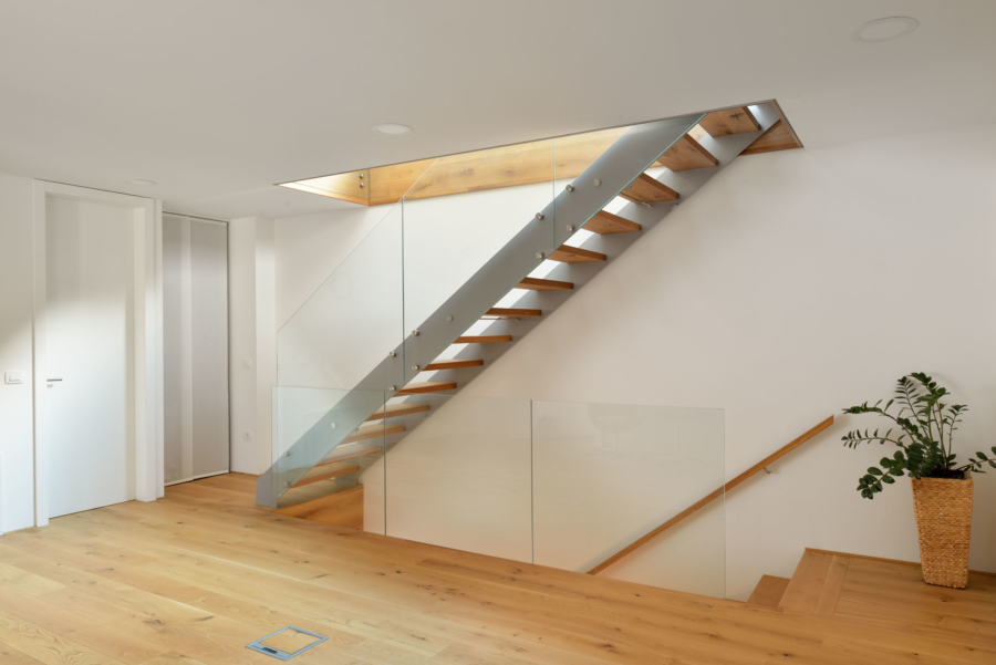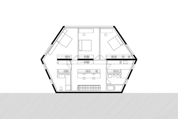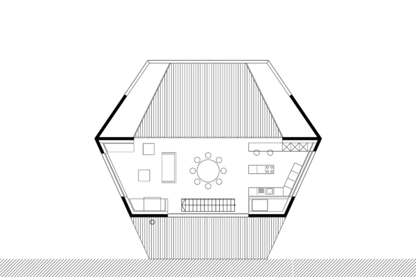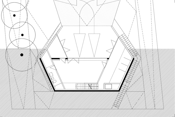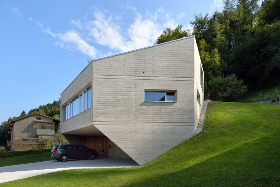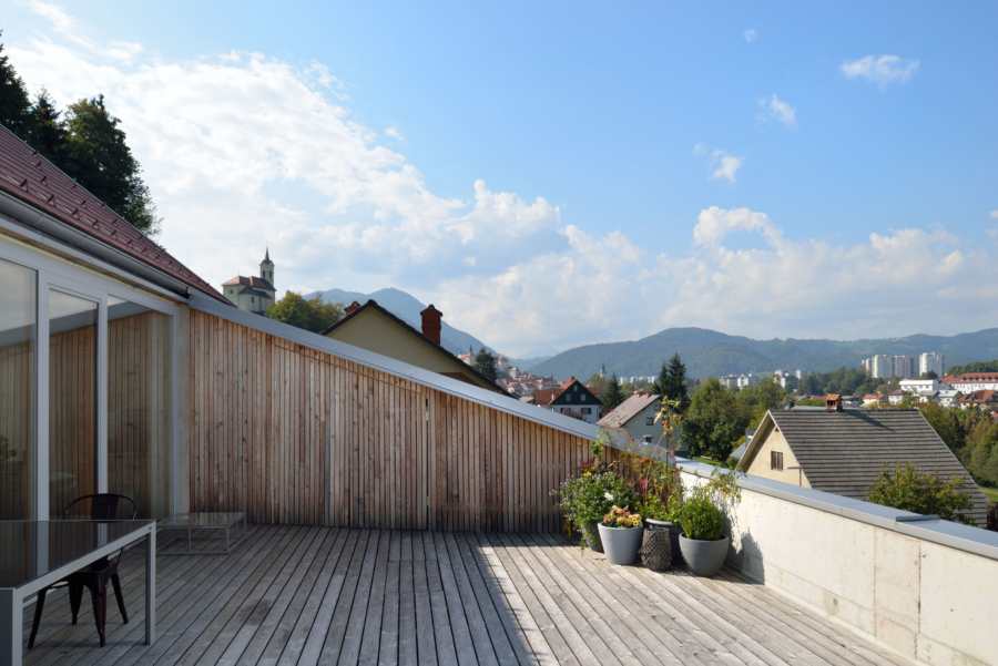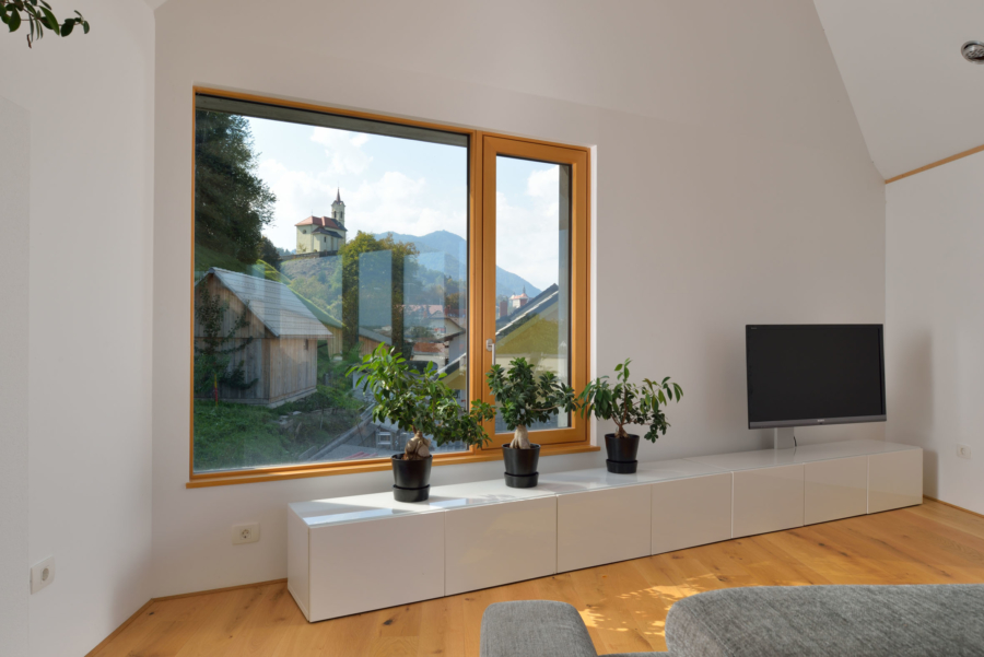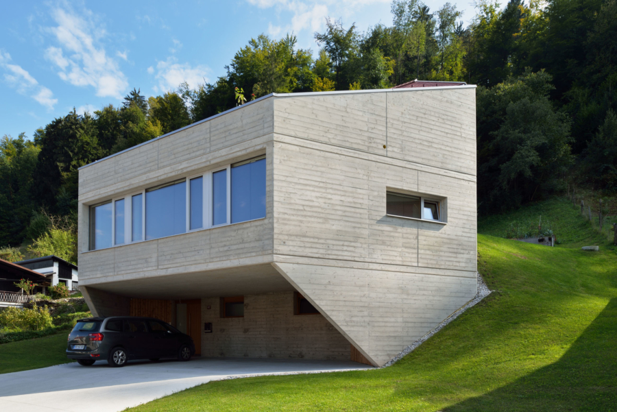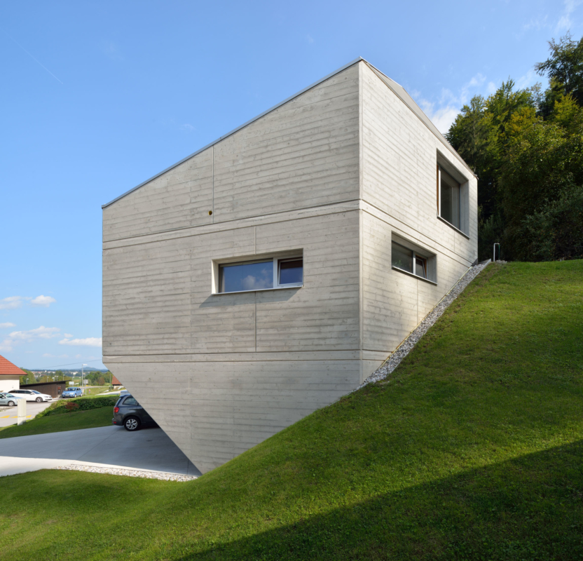 Vprašanja so bila tri, povedo arhitekti: najprej, kako ob že omenjenem hribovju na jugu objektu zagotoviti optimalno osvetlitev? Zaradi naklona terena in vkopanosti objekta so se bivalni prostori premaknili iz tradicionalnega pritličja v zgornjo etažo, kjer lovijo južno sonce skozi velike odprtine, spalni del pa je umeščen na temnejšo spodnjo stran. Drugo vprašanje so bili pogledi – mimo okoliške zazidave se namreč odpira panorama Sorškega polja in Alp na severu. Arhitekti so na to odgovorili z veliko razgledno teraso v zgornji ter dolgim panoramskim oknom v spodnji etaži. In še tretjič: kako objekt prilagoditi pritisku zemljine, ki ga tu in tam dodatno obremenjujejo hudourniki? Neortodoksna geometrična oblika stavbe ni naključje, temveč se elegantno odziva na statične potrebe objekta.