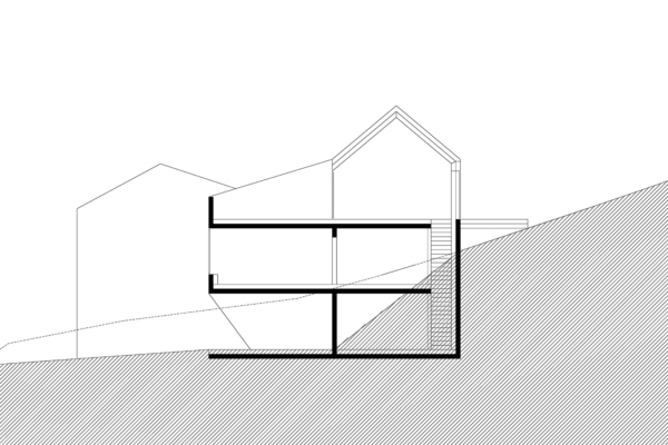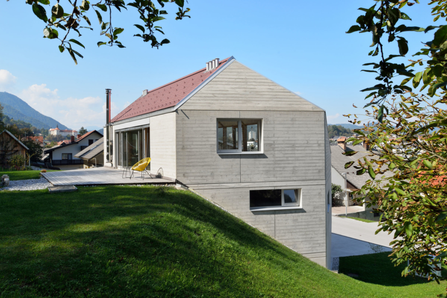 Pod vznožjem hribovja, ki Škofjo Loko obroblja z jugozahoda, v mesto vodi stara cesta, ob kateri se pobočja začnejo zelo strmo dvigovati. Kljub temu je tam zraslo dolgo obcestno naselje in prazno parcelo v njem je preteklo leto zasedla nova enodružinska hiša, ki so jo načrtovali v arhitekturni pisarni 3biro. Strmina, na kateri hiša stoji, je tudi odločilni dejavnik za njeno zasnovo: da bi rešili nekaj osnovnih vprašanj lokacije, so arhitekti stavbo zasadili v zemljino kot zob. Z globoko korenino in neortagonalno obliko se hiša tako staplja s krajino in upošteva lokalne robne pogoje.