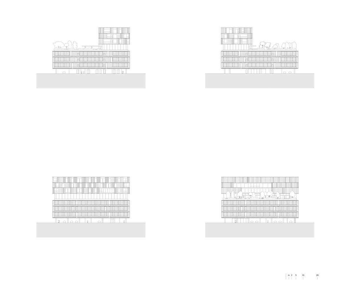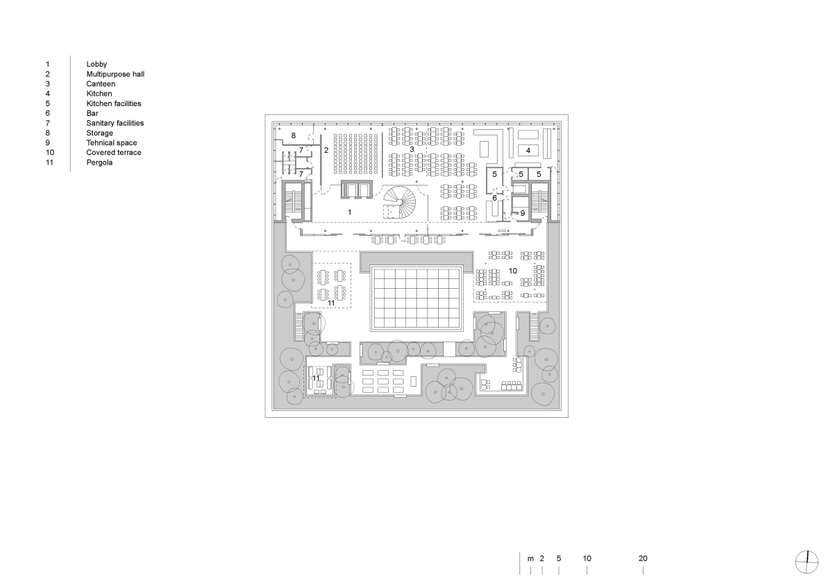 Nad pisarnami se dobra polovica tlorisne površine sprosti za oblikovanje zelene terase oziroma kar malega parka nad tlemi; ta je oblikovan tako, da prostor med koriti z zelenjem oblikuje poti in male trge ter tako tvori prostore z različnimi stopnjami intimnosti in javnosti. Zastekljeni piano nobile ob tej zeleni »plazi« je namenjen restavraciji s konferenčnim prostorom.