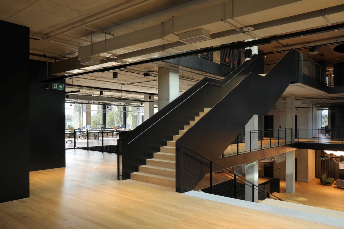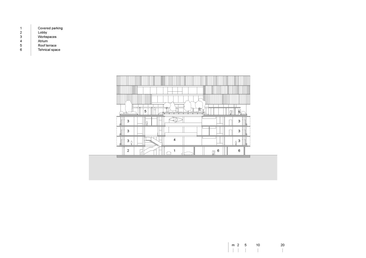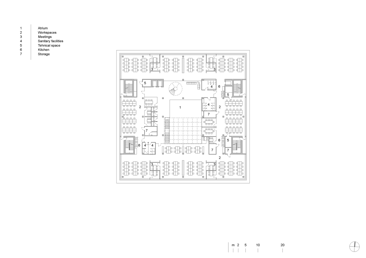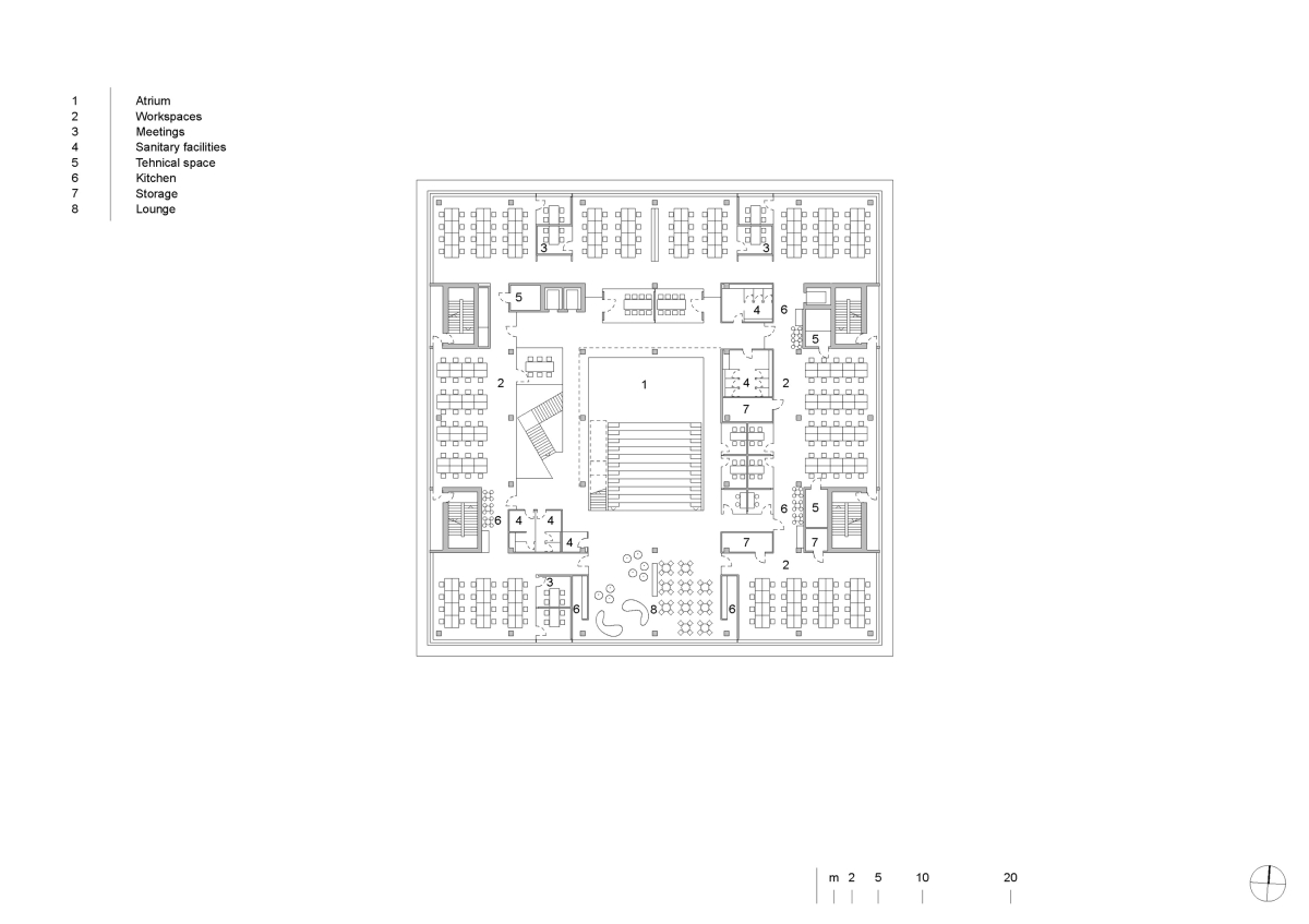 Pisarniško bazo nad pritličjem povezuje velik notranji atrij z zenitalno svetlobo, ki služi tudi kot avditorij. Atrij je zamišljen kot živahen notranji trg s poudarjenim stopniščem in prostorno »promenado« ter tako kompenzira pomanjkanje urbanega utripa v primestnem kontekstu.