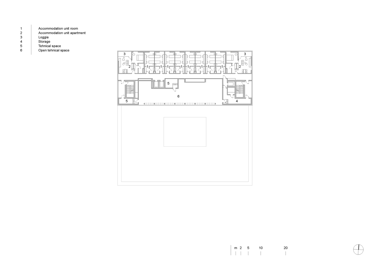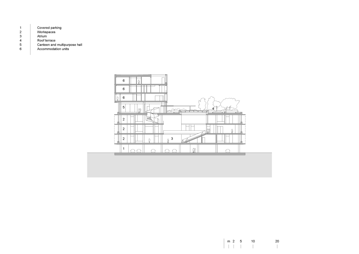 Razumevanje stavbe kot hibrida je arhitekte iz uveljavljenega zagrebškega biroja 3LHD vodilo do osnovnega koncepta zlaganja programskih/prostorskih elementov v višino. Odprtemu pritličju, v celoti namenjenemu garaži, sledi trinadstropna baza pisarniških prostorov, nad njo pa se kot znova bolj odprta cezura vzpostavi piano nobile, prehod med pisarniško cono in prenočišči, ki kot najbolj zaprt volumen zaključujejo vertikalno kompozicijo.