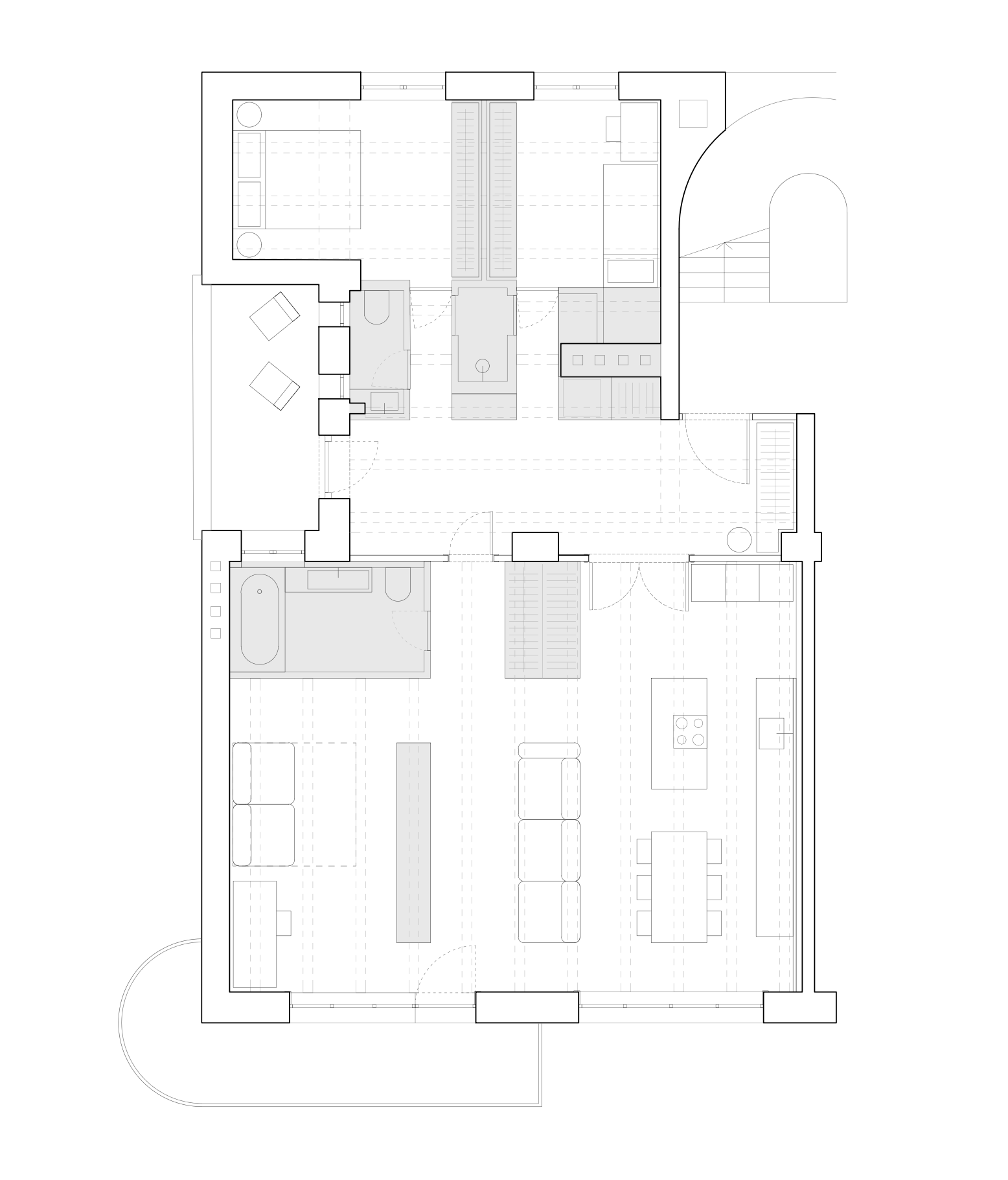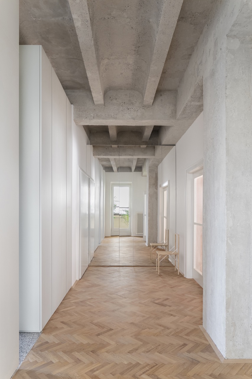 Na ta način pride posebej do izraza osrednji arhitekturni element prenove, ki ga avtorji v stanovanje niso vnesli, pač pa so ga najprej metaforično in potem dobesedno odkrili. Nad stropom stanovanja se je namreč med procesom raziskovanja pokazala ekspresivna medetažna konstrukcija iz armiranobetonskih reber in čeprav beton ni bil izveden kot zaključni sloj ter je bil na več mestih načet, so naročnika uspeli prepričati, da nepričakovano odkritje vključijo v podobo interierja kot povezovalni element, ki se pne preko celotne površine stanovanja. Beton stropa in prav tako razkritih nosilnih stebrov so skrbno sanirali, nekoliko grob in neenoten videz pa v sicer umirjeno eleganco interierja vnaša prvinski kontrast.