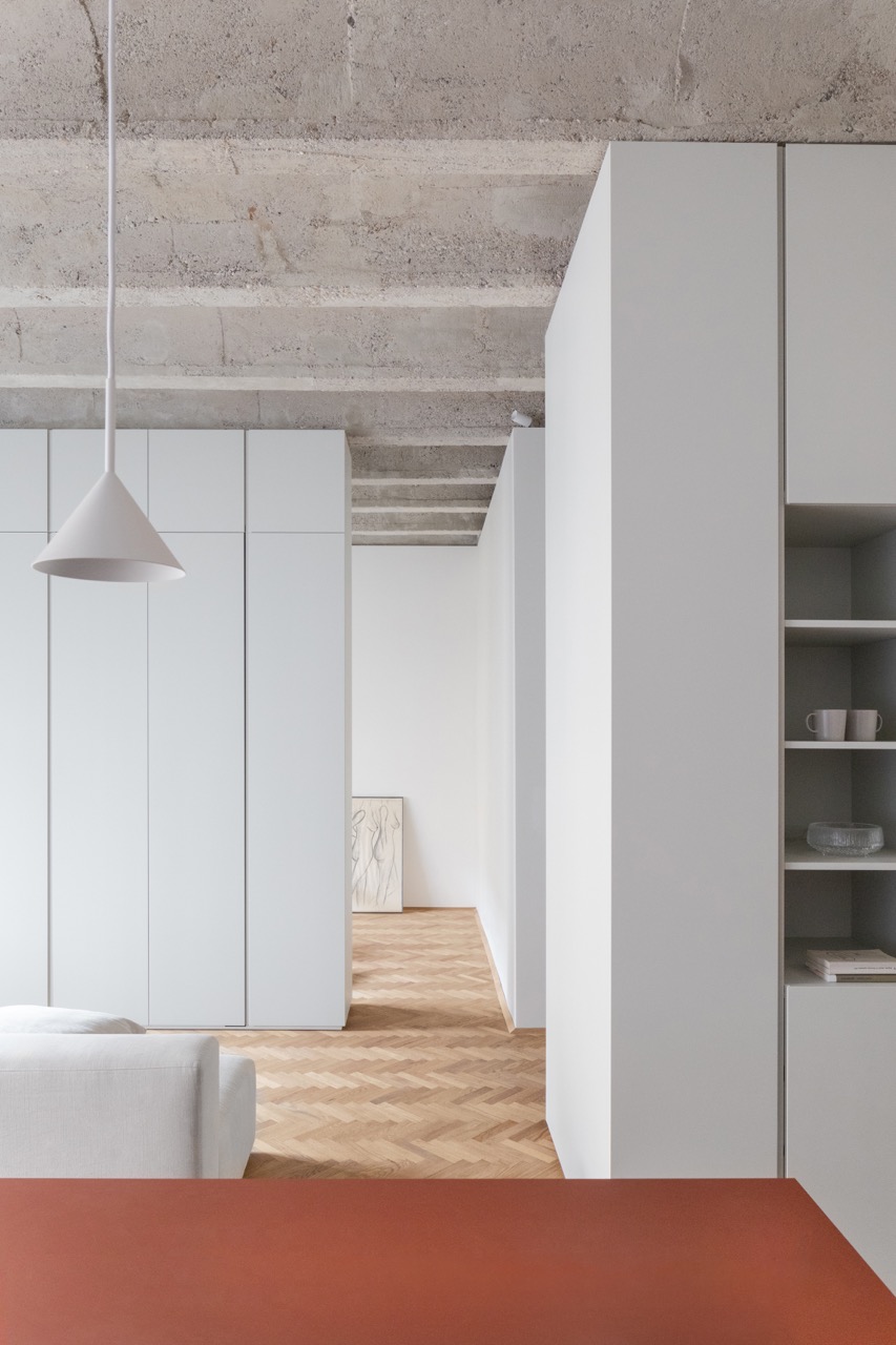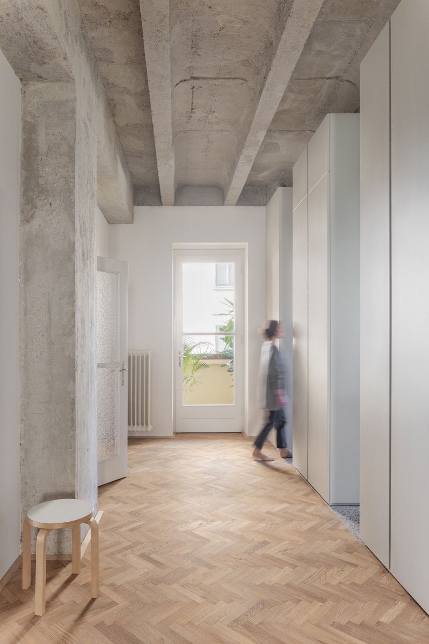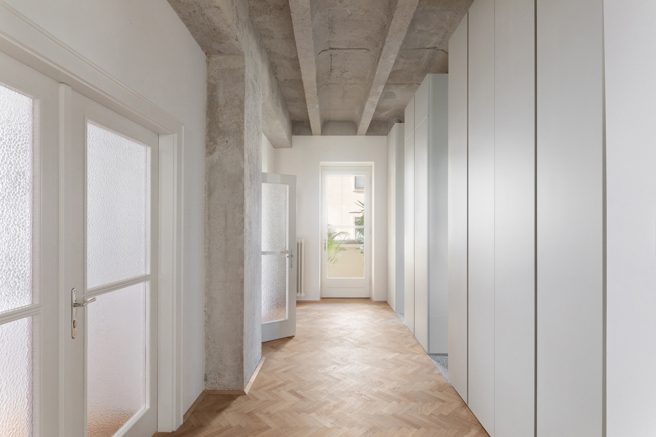 Stanovanje je ob nakupu še imelo ohranjene kvalitetne izvorne elemente, a je bila prvotna jasnost tlorisne zasnove z naknadnim zapiranjem prostorov zabrisana, originalna funkcionalna logika, ki je vključevala sobo za hišno pomočnico, pa tudi sicer ni bila več aktualna. Osnovno vodilo prenove je bilo zato vzpostavljanje berljivosti prostora v skladu s kvalitetami prvotne zasnove in sodobnimi bivanjskimi navadami. Stanovanje so odprli v prečni in vzdolžni smeri, konceptualno pa so ga povezali z enovitim principom vstavljenih volumnov, prepoznavno avtorsko potezo kolektiva: elementi vgradne pohištvene opreme in servisni prostori so obravnavani ločeno od arhitekturne »lupine« – konstrukcijskih elementov in oboda, kar je izraženo v enotni obdelavi; tu jih povezuje nežno siva barva.