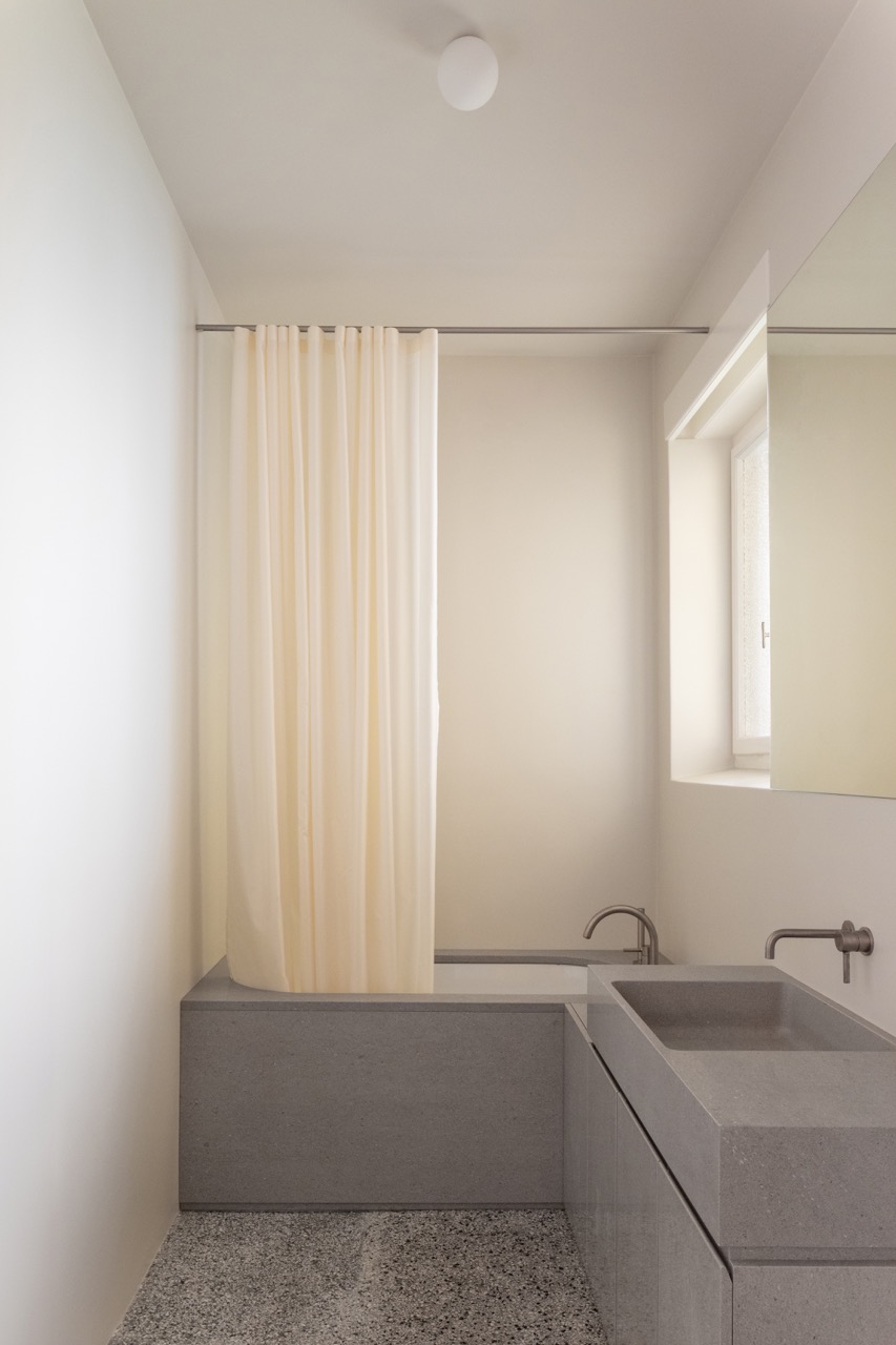 Dnevni prostor na drugi strani zamejuje pohištveni volumen, za katerim se ob diskretno umeščeni kopalnici oblikuje še manjša soba, namenjena odmiku in delu, ki se v prihodnje po potrebi lahko z minimalnim posegom spremeni v dodatno spalnico.