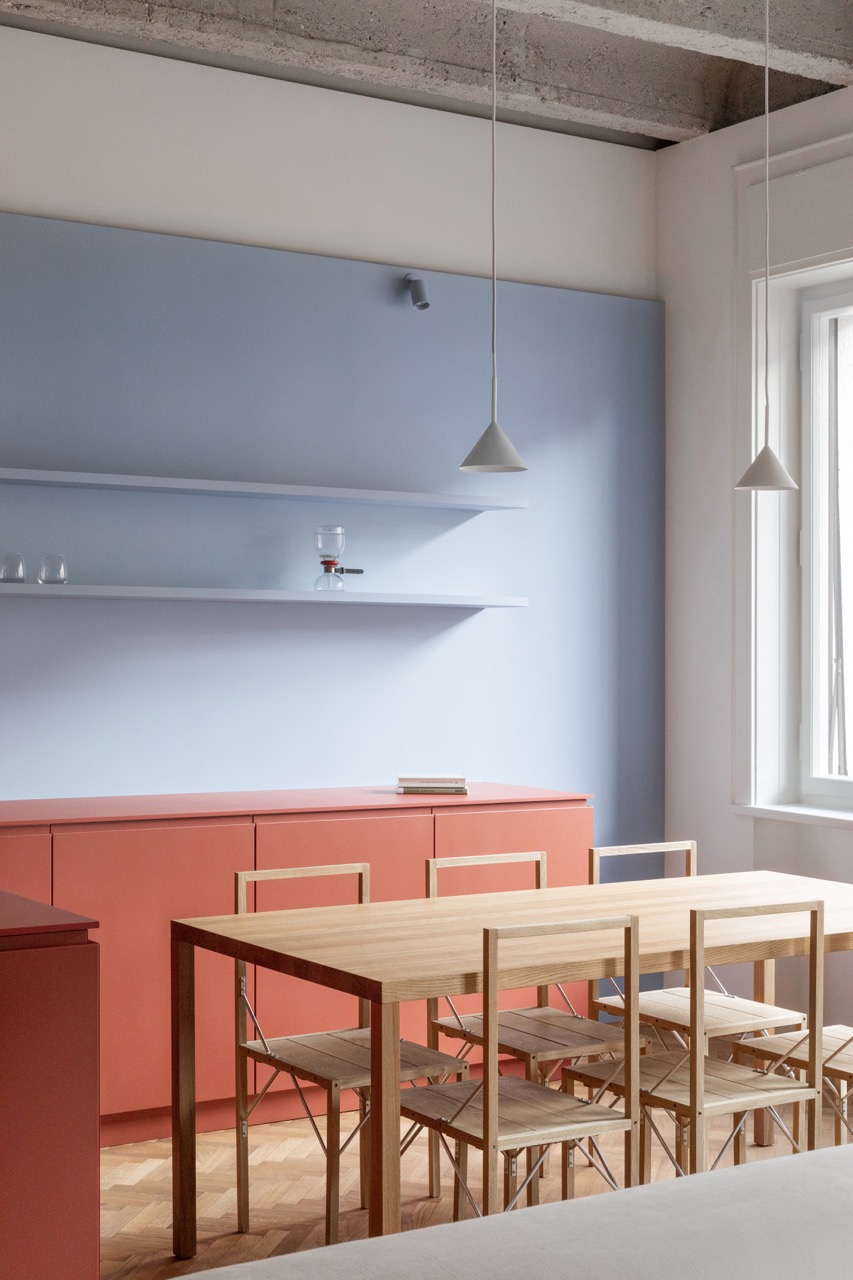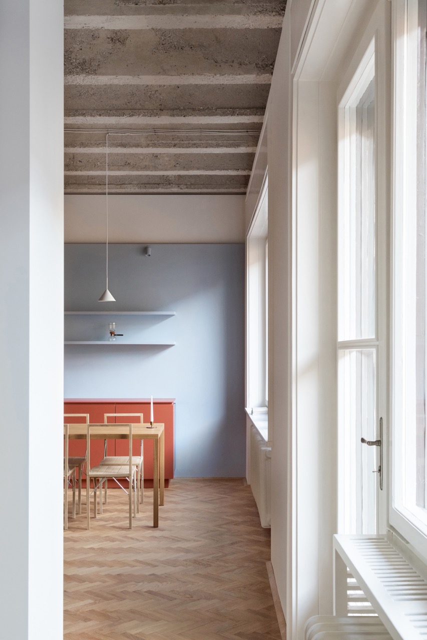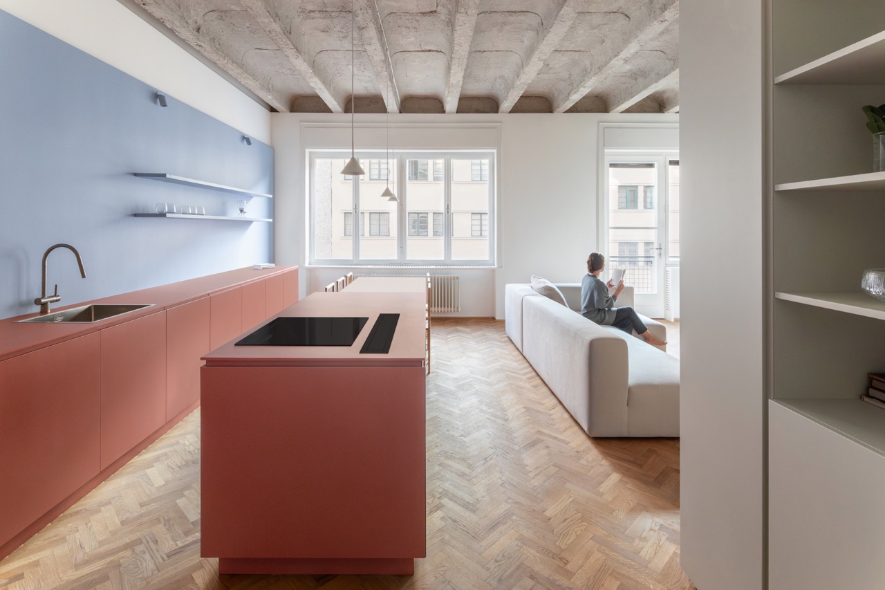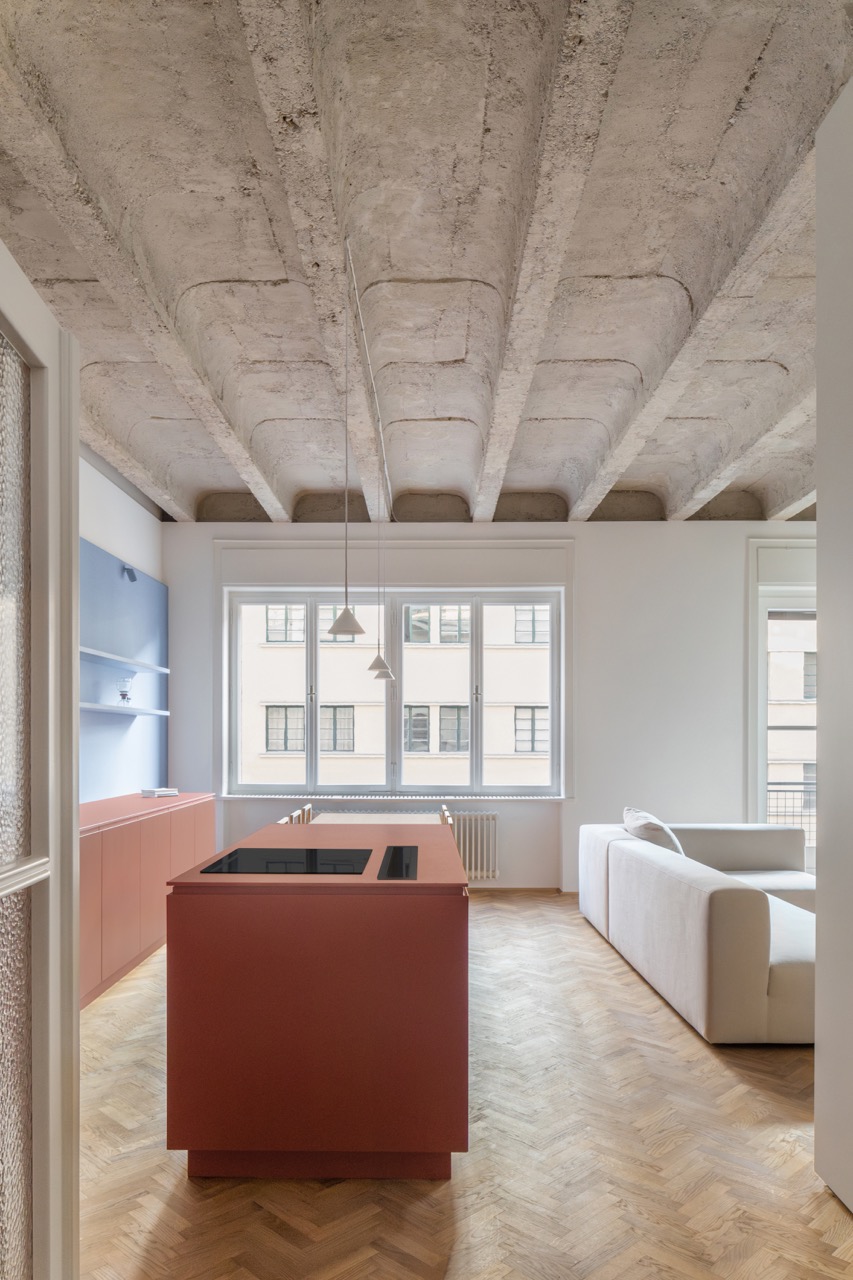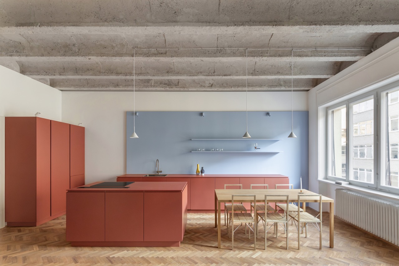 Velik, svetel in zračen dnevni del stanovanja se navezuje na balkon na ulični strani bloka in je nastal z združitvijo prej ločenih sob. Središče dogajanja je kuhinja, ki so jo prestavili iz manjše zaprte sobe. Kuhinjska oprema kot izjema odstopa od principa enotnih vstavljenih volumnov: vsi kuhinjski elementi so zasnovani kot otoki, ki ne segajo do stropa, ambient pa sije v dialogu dveh osnovnih barv – rdeče obarvanih kuhinjskih elementov in modre pralne površine za kuhinjskim pultom. Barvi so arhitekti vzeli iz Le Corbusierove palete ter se tako poklonili pionirskemu obdobju moderne arhitekture, v katerem je nastala stavba. Kuhinjo dopolnjuje masivna hrastova miza osnovnih oblik, ki se skupaj s stoli Lajt Janeza Suhadolca ubrano poveže z materialnostjo parketa in geometrijo prostora. Središčnost jedilnega ambienta poudarjajo tri viseče svetilke – povsod drugod je osvetlitev integrirana v opremo oziroma indirektna.