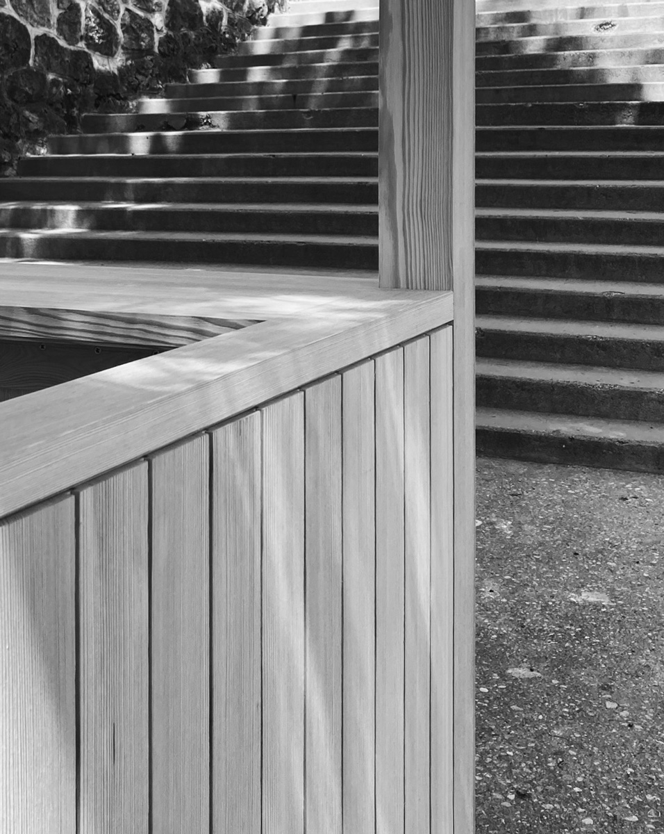 ES: V svoje delo vnašamo tradicionalne tehnike, obdelave in materiale. Pokazati želimo, da jih lahko polnovredno uporabljamo tudi v sodobnem oblikovanju. S tem ohranjamo tudi del nesnovne dediščine. Kot je zapisal Ravnikar: »Arhitekt, ki misli skozi delavčeve roke, pripoveduje z logiko konstrukcije, z najdbo prave oblike, varčnostjo pri gradivu, z rahlim ali trdim držanjem orodja, z robatostjo ali obrušenostjo, za kakšen namen je delal. In občutljiv človek ve, kaj mu narejene stvari pripovedujejo.« Pri projektu sladoledne stojnice smo imeli zaradi majhnega merila odlično priložnost poglobljeno se ukvarjati z materiali in detajli. Predvsem v manjših projektih vidimo priložnost, da projekt podrobneje razdelamo še s tega vidika.