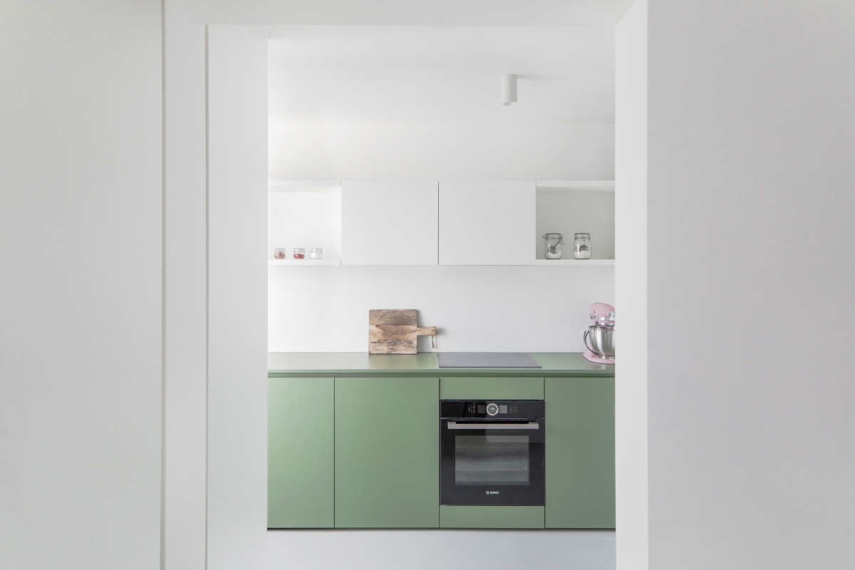 Notranje prostore so dodatno optično povečali z velikim ogledalom, ki navidezno podaljšuje garderobni hodnik, prevladujoča belina zidov in vgradnih elementov pa svetlobo pelje v globino stanovanja. Edini barvni kontrast v zasnovo stanovanja vnaša oprema v kuhinji in dnevni sobi v odtenkih nežno zelene, ki interier povezuje z drevesi pred blokom.