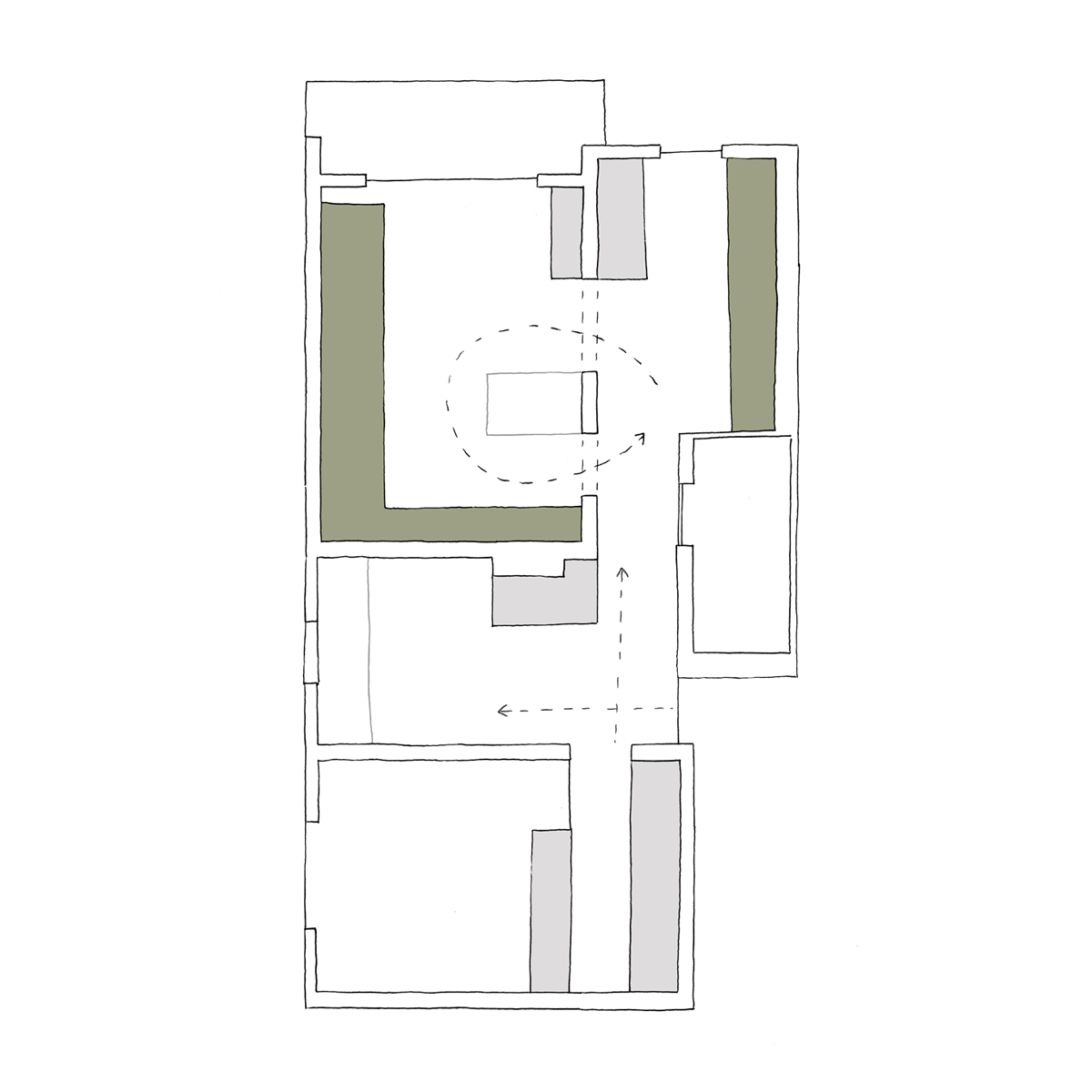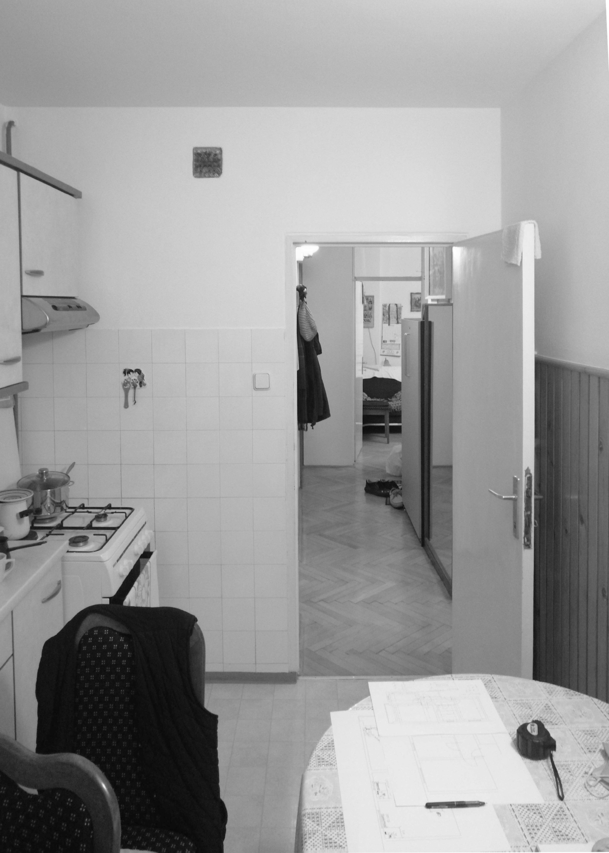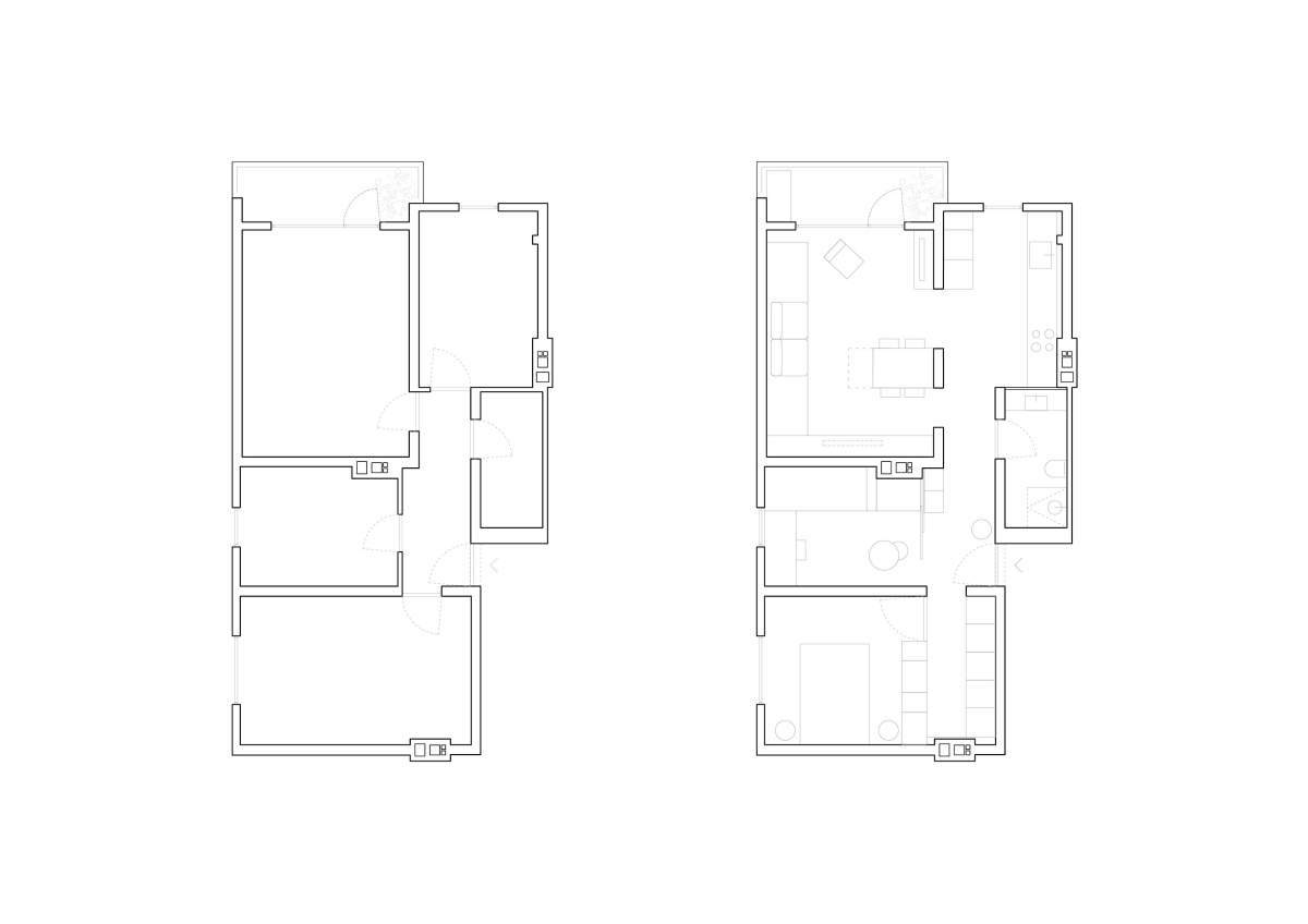 Z minimalnimi preboji in novim svetlim tlakom so oblikovali povezan, svetel bivalni prostor. Pri tem so mestoma vrata odstranili ali premaknili. V kabinetu (otroški sobi) so vpeljali drsna vrata, ki lahko v celoti odprejo steno, in ga tako povezali s hodnikom v enoten prostor. Z visokimi svetlimi servisnimi elementi opreme so zrahljali delitev na dnevni in spalni del stanovanja