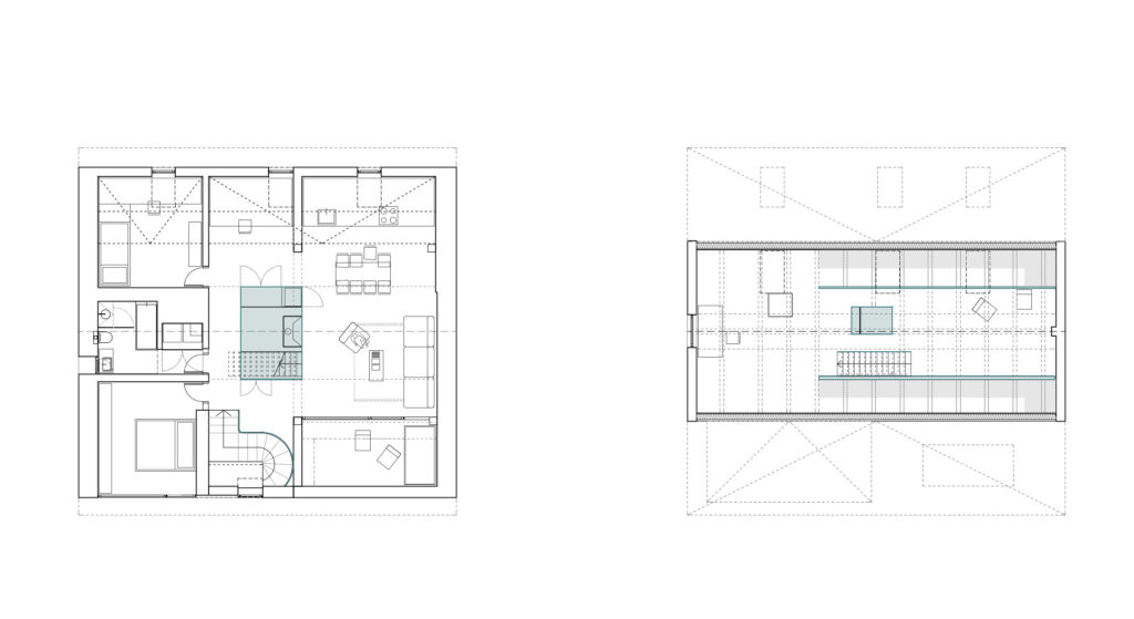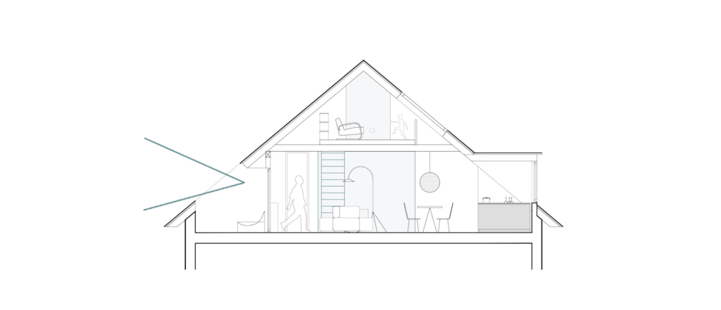 Arhitekti biroja a2o2 so mansardno stanovanje, razmejeno s stenami, spremenili v zasnovo odprtega tlorisa in po višini povezanega bivalnega prostora. Ta je organiziran okrog osrednjega volumna, ki obdaja obstoječi opečni dimnik s kuriščem. V volumen so umeščene tudi stopnice, ki vodijo na galerijo s knjižnico in domačo pisarno. Odprtost stropa omogoča padanje svetlobe iz zgornje etaže v bivalne prostore prek tramovne konstrukcije, ki je bila nekoč skrita v lesenem opaženem stropu. Ta je izpostavljena kot kakovosten obstoječi element, ki se vplete v organizacijo nove zasnove in hkrati z originalno opečno steno kaže avtentično materialnost stavbe.