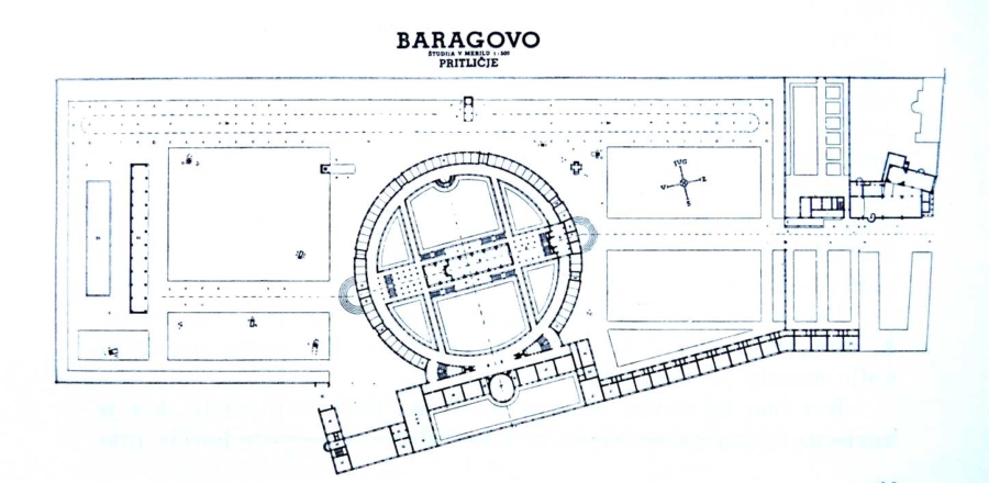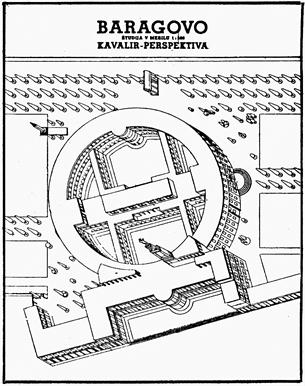 Hram Slave, Plečnikova zamisel na mestu kasneje zgrajenega Baragovega semenišča (risal: Edvard Ravnikar)