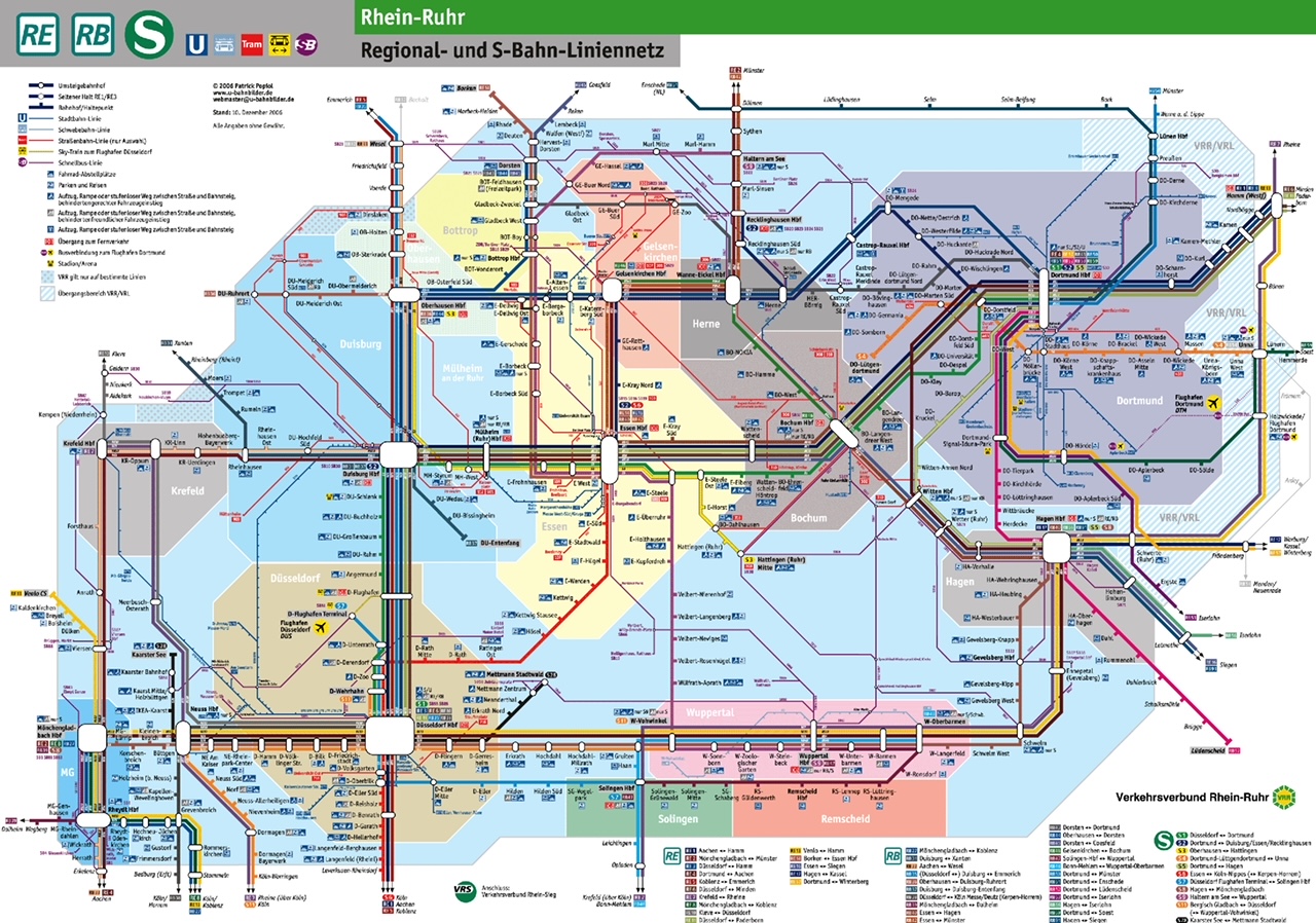 Shema regionalne povezanosti mest porurške regije z možnostjo nadaljne povezavo na uporabo metrojev, lahkih železnic, tramvajev in mikromobilnosti (kot so kolesa, skiroji in druge podobne rešitve)