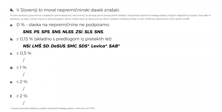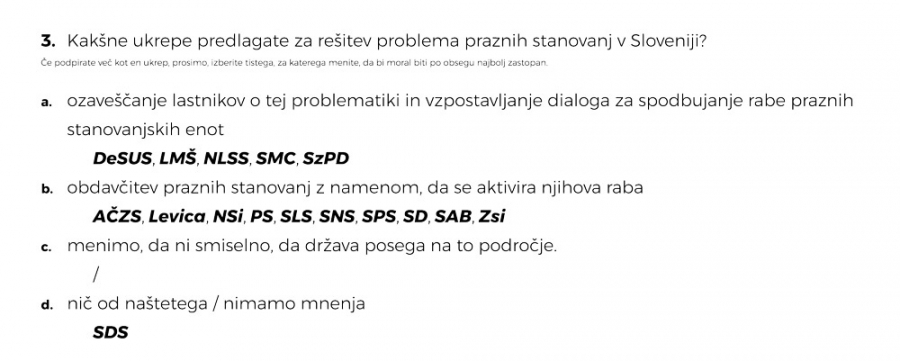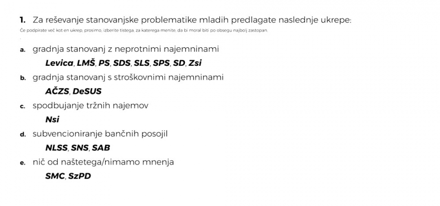 Čez približno mesec dni bodo v Sloveniji potekale parlamentarne volitve, na katerih kandidira 25 političnih strank, in med izvoljenimi bomo po konstituiranju Državnega zbora dobili novo izvršno oblast. V času predvolilnega boja nas zanima, kakšne volilne programe imajo politične stranke na področju stanovanjskih politik in kakšne ukrepe si je posledično mogoče obetati v naslednjih letih. Zato smo se odločili strankam poslati kratko anketo z vprašanji, oblikovanimi tako, da bi se izognili standardiziranim politično pravilnim odgovorom in pridobili jasna politična stališča do pomembnih stanovanjskih vprašanj, ki tako ali drugače zadevajo vsakega državljana. Spodaj predstavljamo in kometiramo stališča tistih strank, ki so se odločile za sodelovanje v anketi.