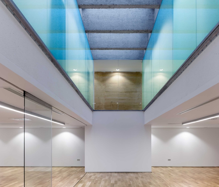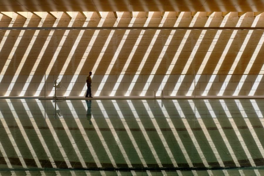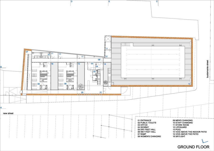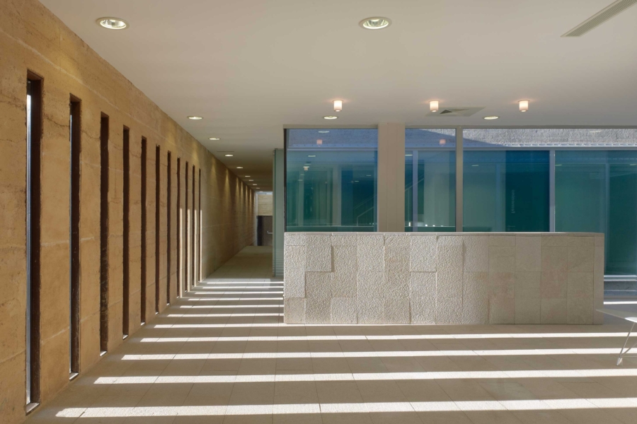 Obodne stene preprečujejo poglede iz okolice in proti mestu obračajo čvrsto fasado, ki pa je zaradi edinstvene materialnosti zbite zemlje kljub vsemu skoraj ornamentalna. Za obodno steno se dvigajo strehe garderob, in tako je že z ulice mogoče slutiti, da se v notranjosti stavbe skriva večja razgibanost. Takoj, ko stopimo čez prag, se pred nami odpre serija notrajih dvorišč, senčnih in sončnih prostorov, ki obkrožajo glavni bazen – pravo mediteransko kopališče, ki v vročih poletnih dneh s premišljenim senčenjem in ventilacijo, pa tudi zaradi izbire materiala, nudi hladno oazo sredi mesta.