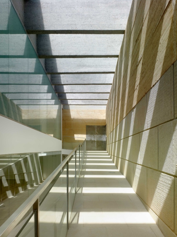 Obodne stene preprečujejo poglede iz okolice in proti mestu obračajo čvrsto fasado, ki pa je zaradi edinstvene materialnosti zbite zemlje kljub vsemu skoraj ornamentalna. Za obodno steno se dvigajo strehe garderob, in tako je že z ulice mogoče slutiti, da se v notranjosti stavbe skriva večja razgibanost. Takoj, ko stopimo čez prag, se pred nami odpre serija notrajih dvorišč, senčnih in sončnih prostorov, ki obkrožajo glavni bazen – pravo mediteransko kopališče, ki v vročih poletnih dneh s premišljenim senčenjem in ventilacijo, pa tudi zaradi izbire materiala, nudi hladno oazo sredi mesta.