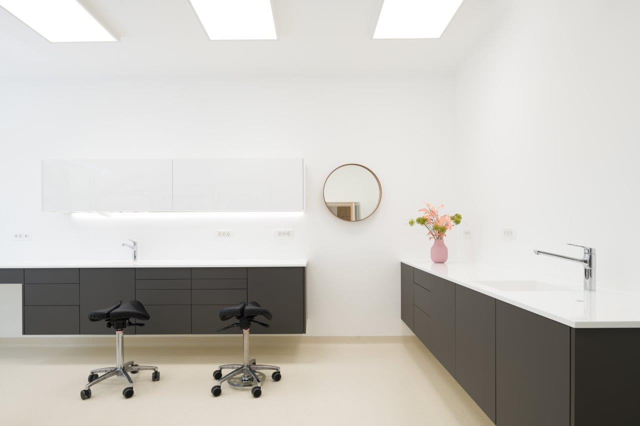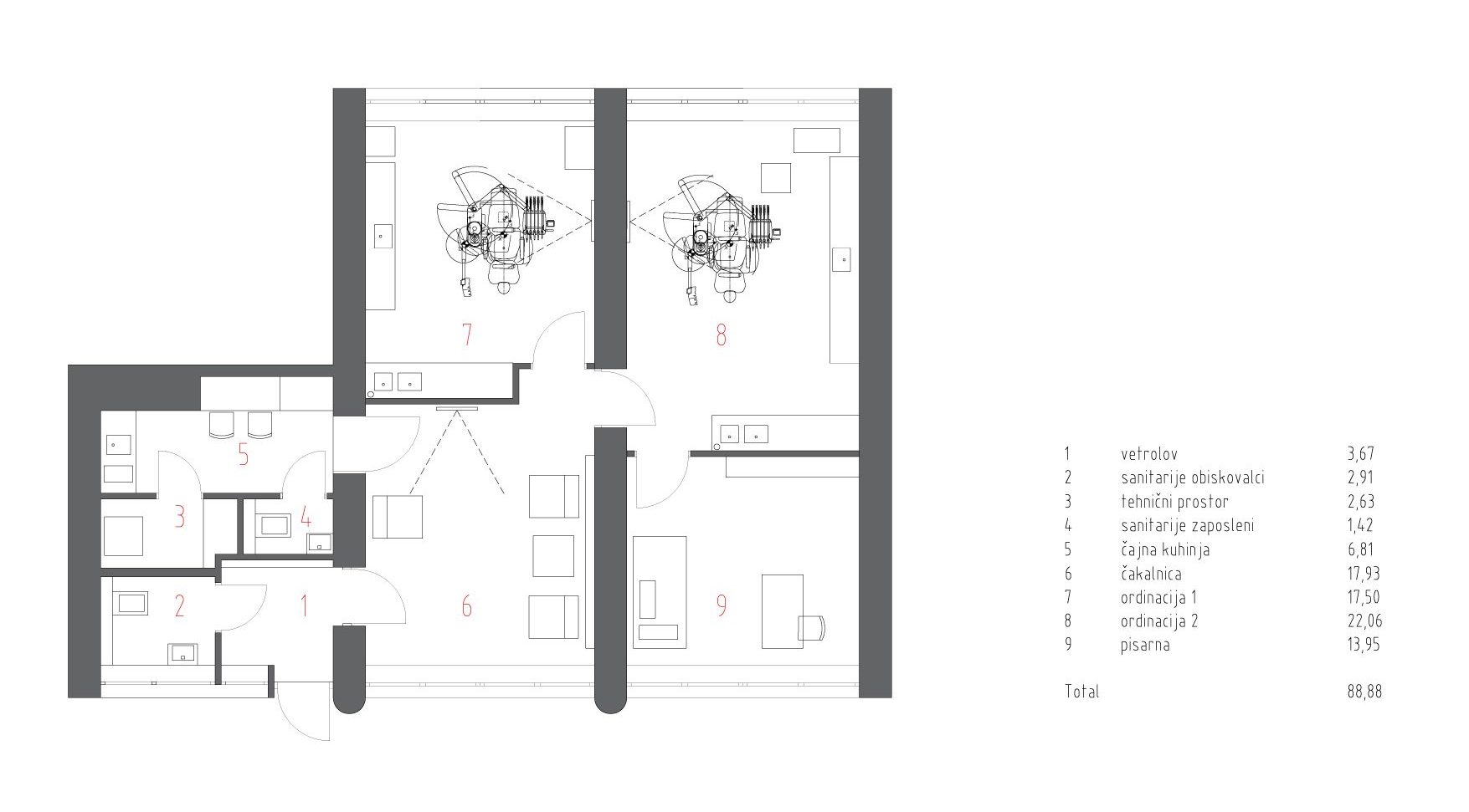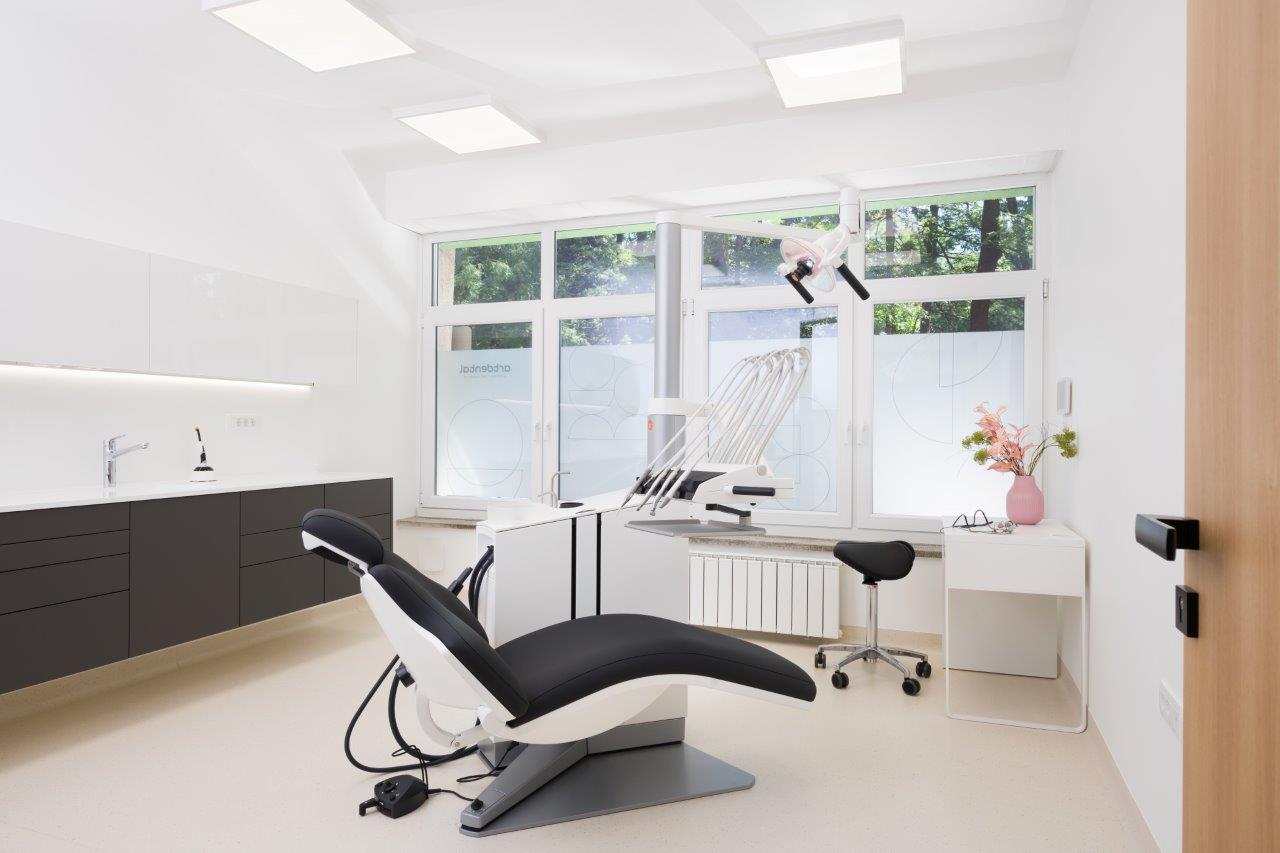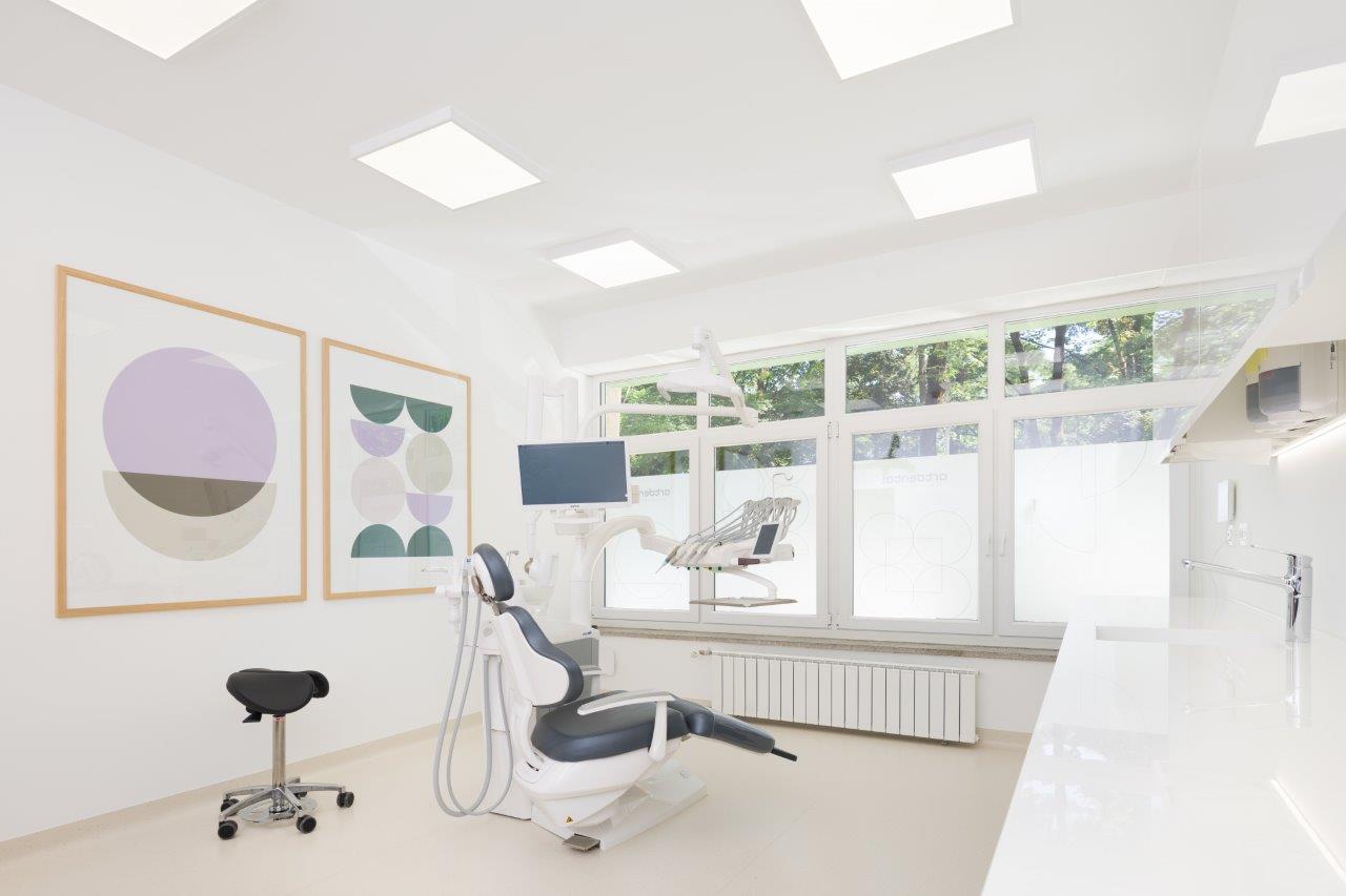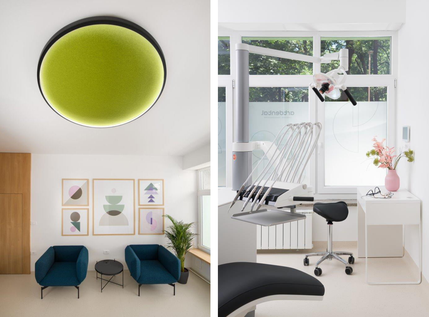 Ordinacijski sobi sta podobno opremljeni, v obliki črke L so v vsako umeščeni na steno vijačeni predalniki in shranjevalne omarice v antracit sivem odtenku, pokriti s preprostim belim pultom. Na eni strani so nadpultne viseče omarice, ki nudijo dodaten prostor za shranjevanje potrebščin ter s svojo belo barvo delujejo lahkotno in vizualno nevsiljivo. Izbrana barvna paleta se odraža tudi v ostali medicinski opremi; zobozdravstvena stola v črno-beli kombinaciji in črni delovni stolčki. Oprema ordinacij je dopolnjena z okvirjenimi slikami enakih grafičnih motivov in odtenkov, kot so tiste na hodniku. Najizrazitejši element ordinacije se pravzaprav ne nahaja znotraj le-te, temveč zunaj, prostorsko sta umeščeni tako, da gledata na park – pacientu se ob sedenju na stolu med opravljanjem posega skozi velika okna odpira pogled na bujne krošnje mogočnih, starih dreves. Iz ordinacije na desni strani je urejen dostop še do pisarne, ostali pomožni program, kot so sanitarije za obiskovalce in zaposlene ter manjša čajna kuhinja, pa so umeščeni ob vetrolov in čakalnico.