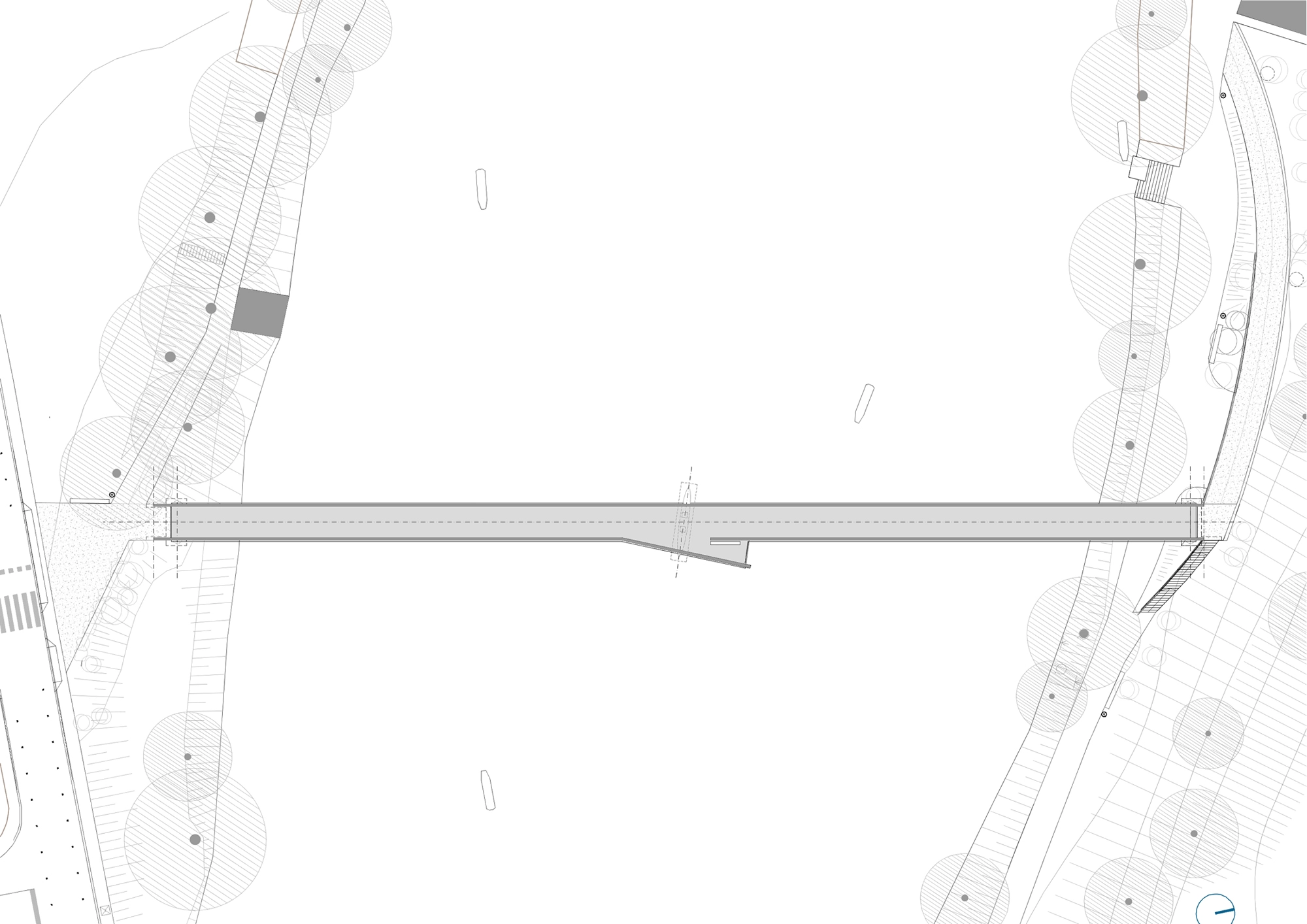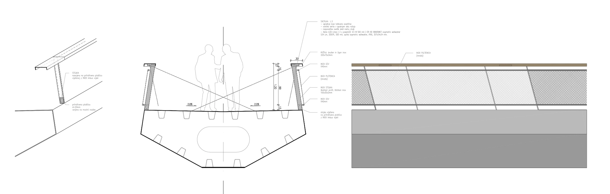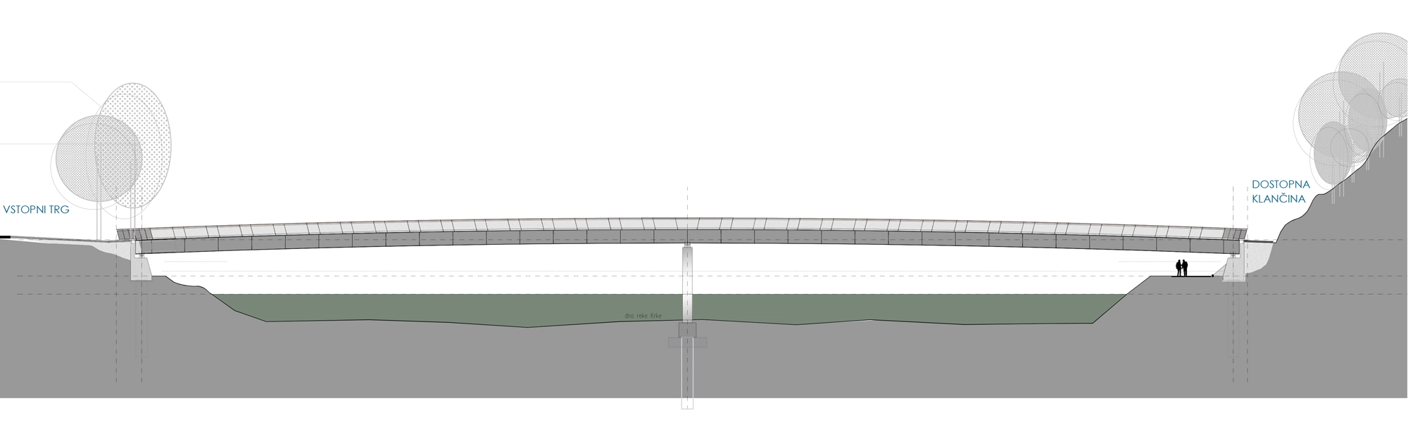 Oporni steber s svojim oblikovanjem poudarja rečni tok. Nad njim se rahlo napeta brv nekoliko razcepi, da se kot majhen štrcelj izoblikuje opazovalna ploščad nad reko s pogledi na okolico, v kateri dominira na eni strani novomeški Kapitelj, na drugi pa dvorca Novi dvor in Kamen. V jekleni naslon mostne ograje so vgravirane ribe, značilne za ekosistem reke Krke.