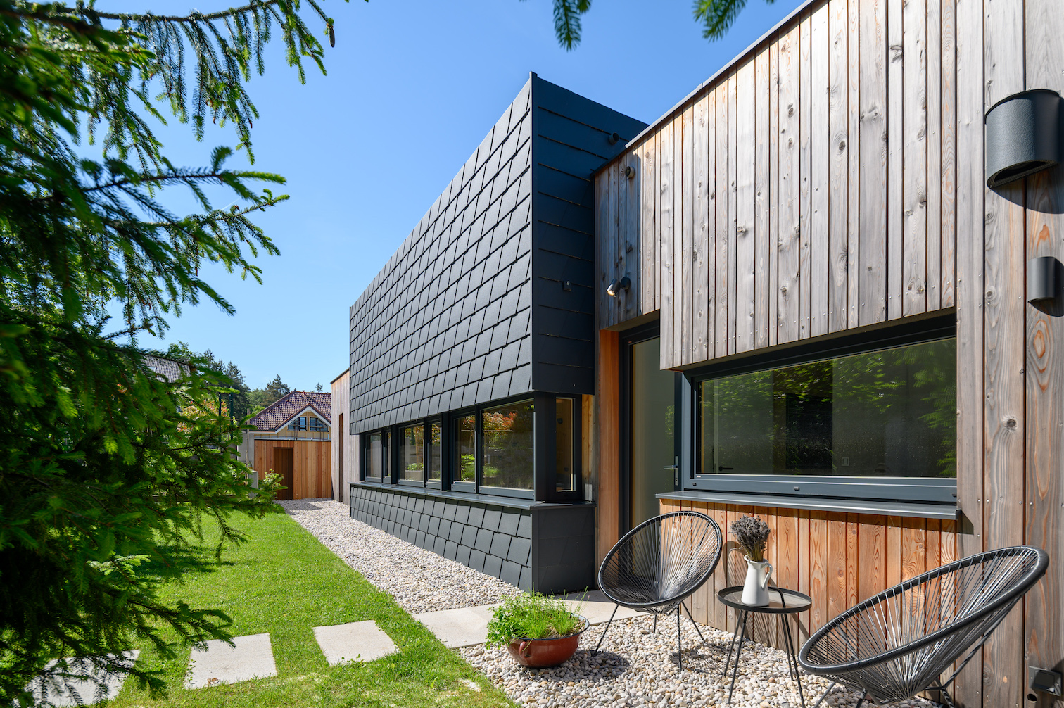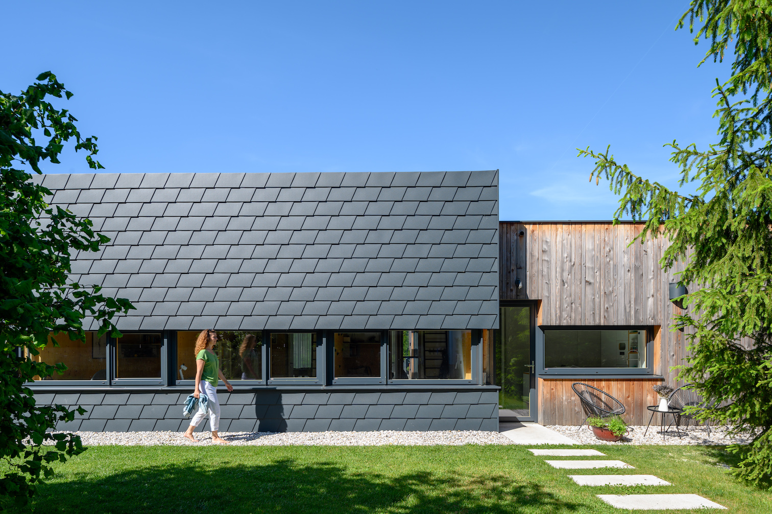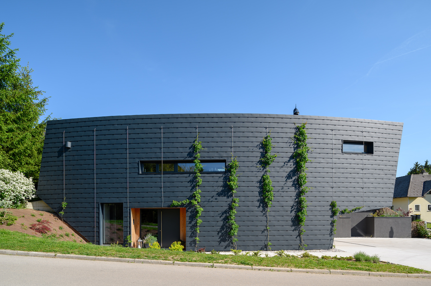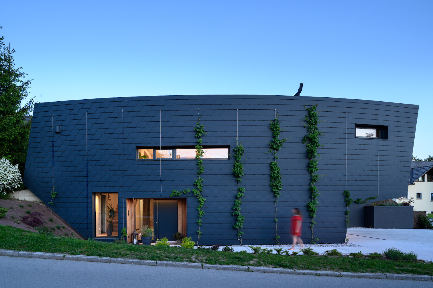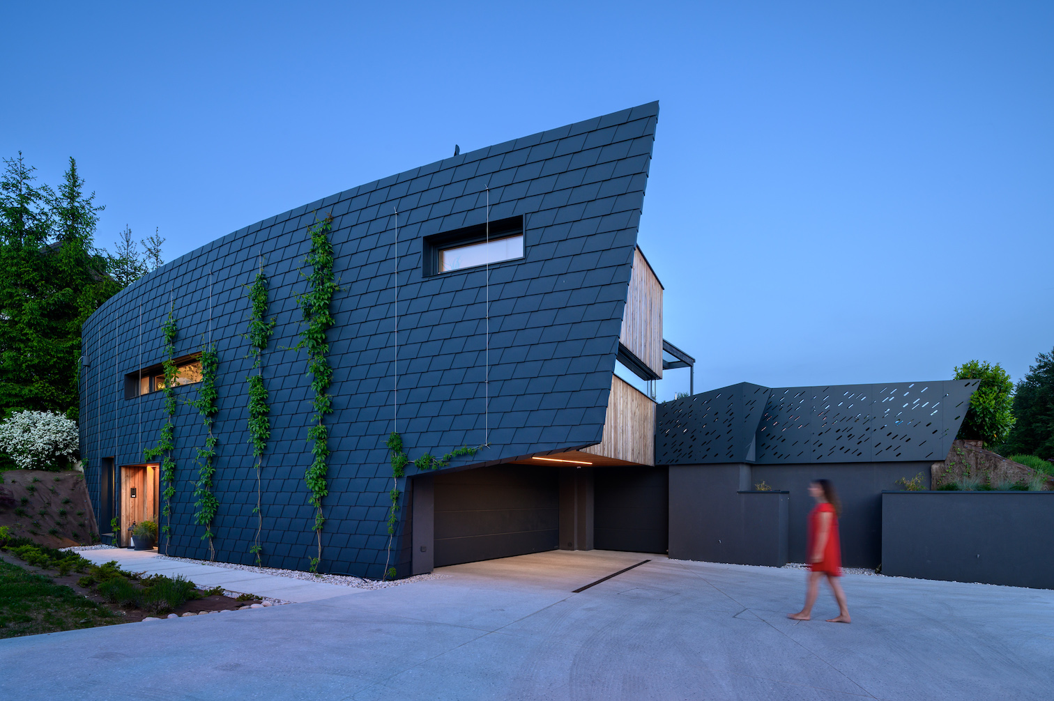 Pojavnost hiše na ulični strani definira visoka izbočena stena s temno kovinsko kritino, ki povezuje oba dela hiše in zagotavlja dodatno plast vizualne oziroma termične zaščite. Zaenkrat se ta »ščit« še nekoliko metalno blešči, v nekaj letih pa ga bo prerasel bršljan in ga preoblikoval v zelen zastor.