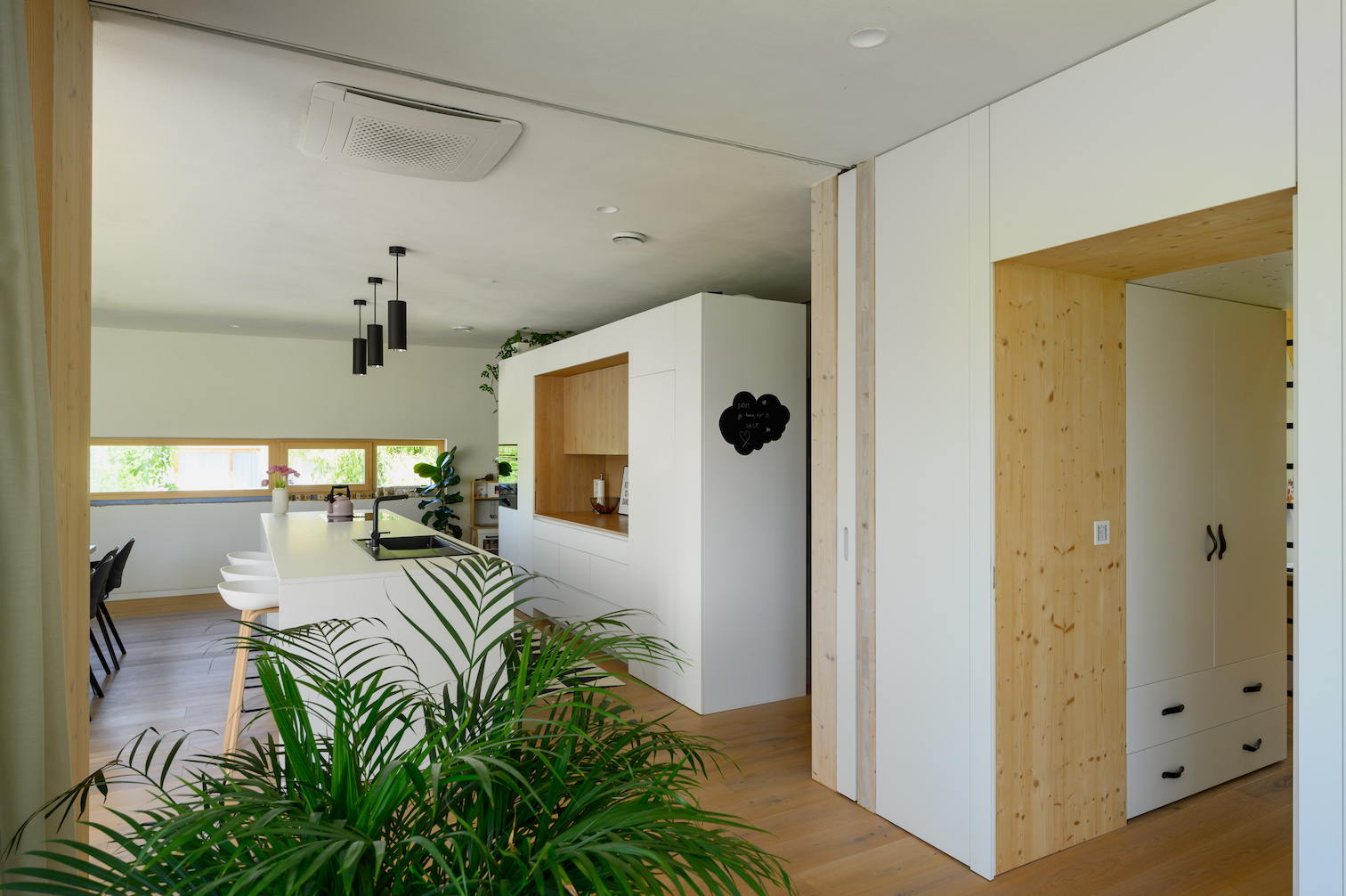 Prostori v vzhodnem delu hiše (spalnice, kopalnice in fantovske sobe) so s prostornim in svetlim hodnikom ob atriju povezani z bivalnimi prostori (kuhinjo, jedilnico in dnevno sobo) v južnem krilu objekta.