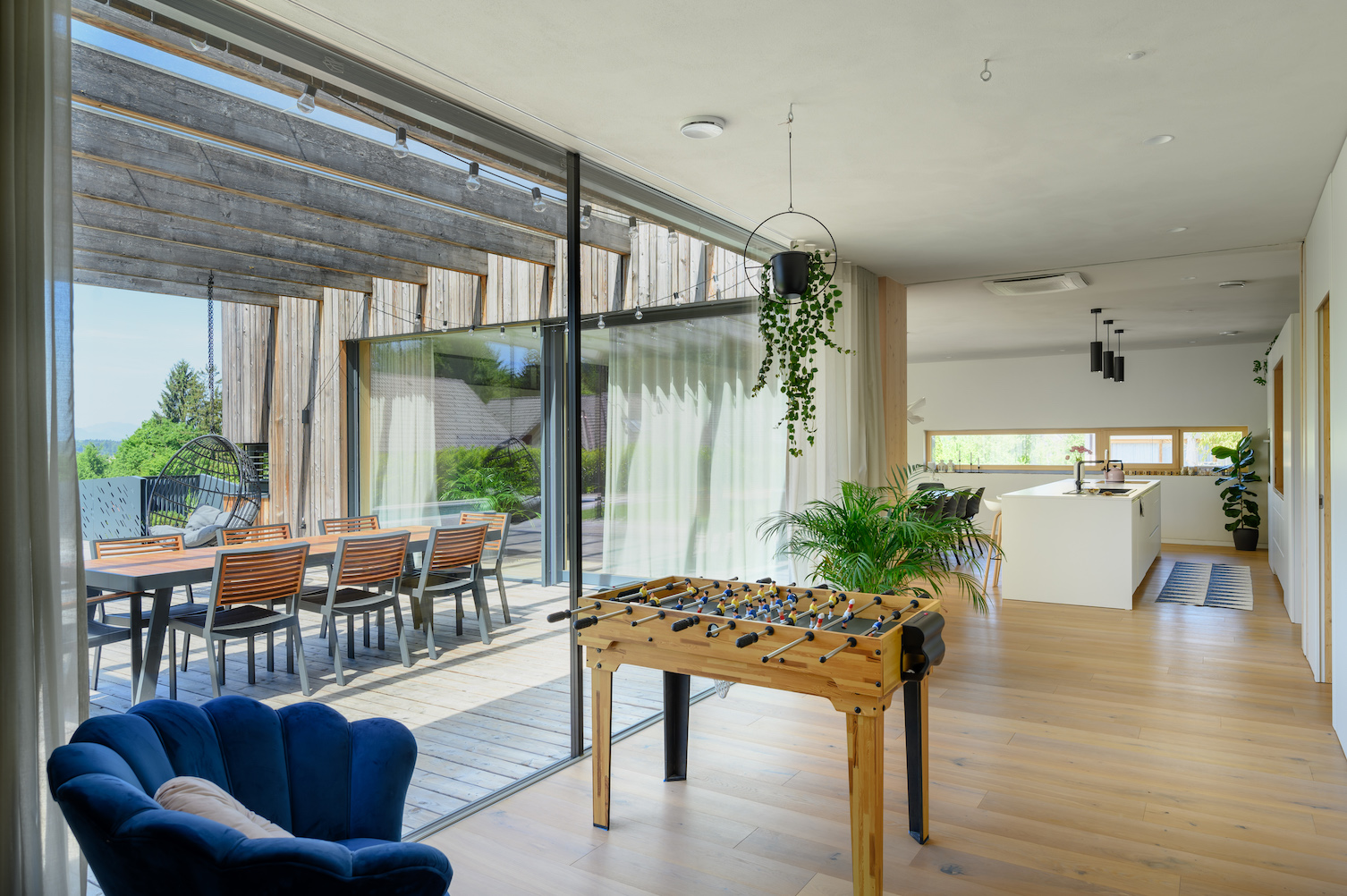 Nova hiša ekipe Mateja Gašperiča je rezultat naročila starih znancev. V besedah arhitekta: »Ona je zobozdravnica in žonglerka, ki ‘obvladuje’ tri fante in dva psa. On je podjetnik/projektni vodja/predavatelj, še najbolj pa ‘geek’. Skupaj so družina, katerih neštete dejavnosti ustvarjajo prepolne serije takoj všečnih fotografij.« Za nov družinski dom so izbrali večji travnik znotraj strnjenega naselja v neposredni bližini Kamnika, ki ga odlikujejo čudoviti pogledi na Alpe, ob tem pa lokacija omogoča vse prednosti primestnega življenja.