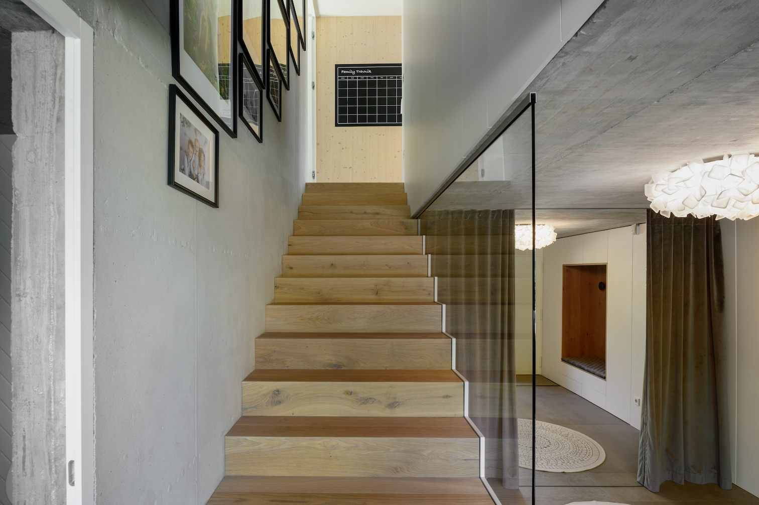 Skozi glavni vhod vstopimo v prostornejše preddverje, iz katerega široko stopnišče vodi navzgor v osrednji, svetel bivalni prostor – srce lesenega paviljonskega objekta, ki je naslonjen na masivni podstavek hiše.