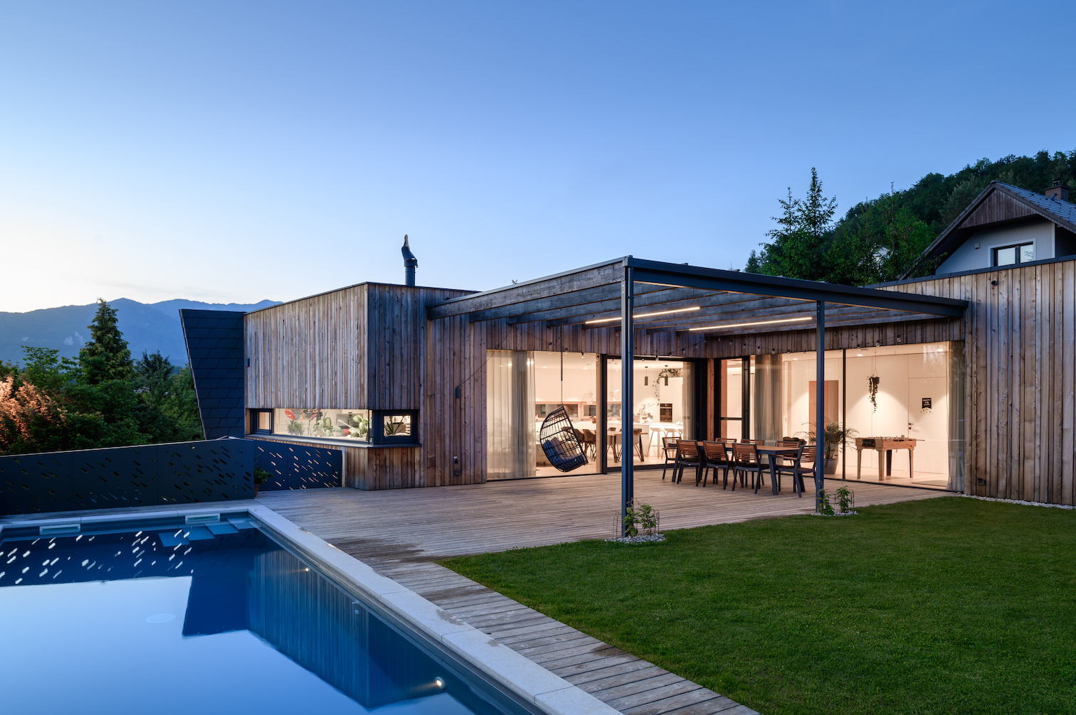 Zgornja etaža v obliki črke L z dveh strani zaobjema in teraso z dvoriščem in jima nudi zasebnost. Teraso zaključi bazen, dvignjen nad raven ceste. Tako je intimni del dvorišča še dodatno zaščiten pred pogledi, stanovalcem pa omogoča neovirane razglede na okoliške gozdove in gore v daljavi.