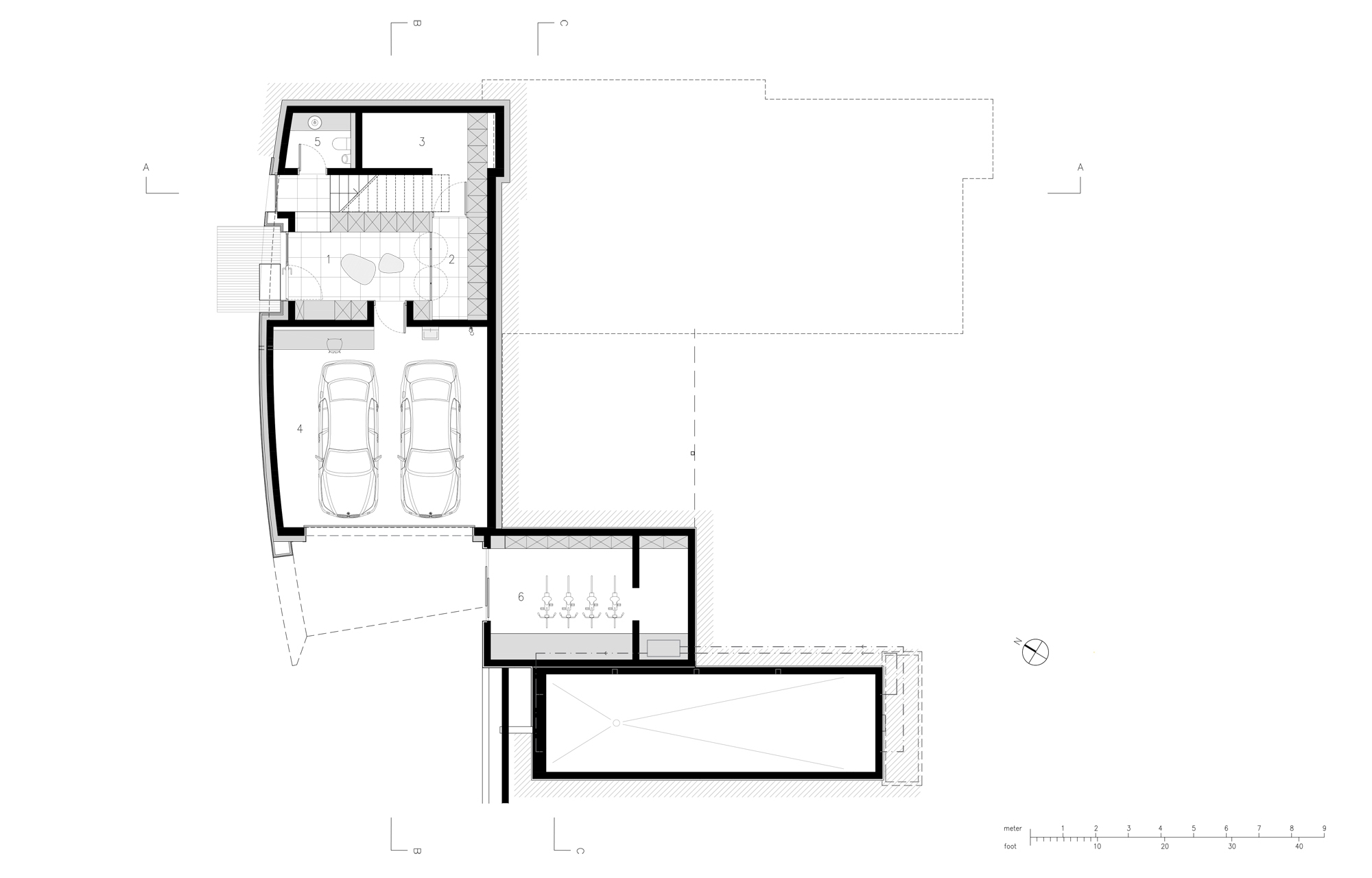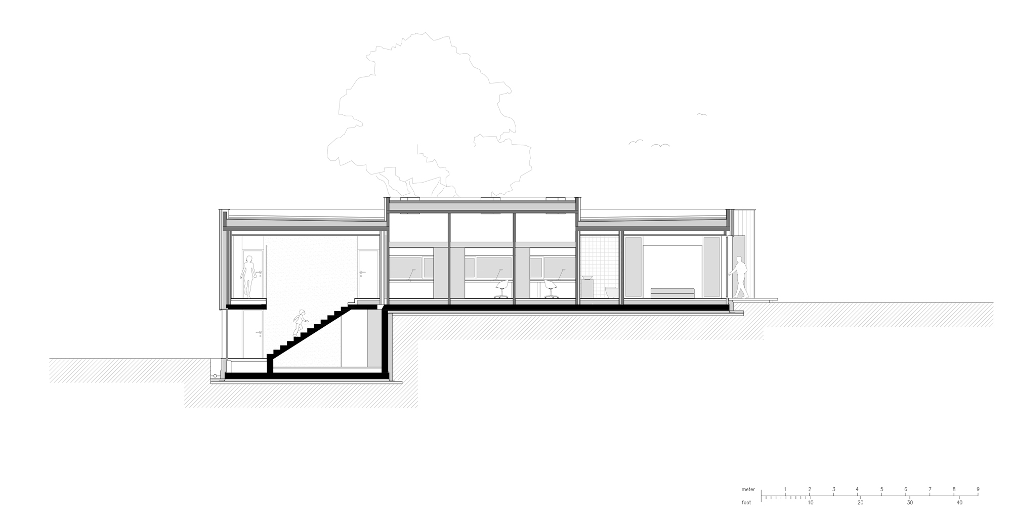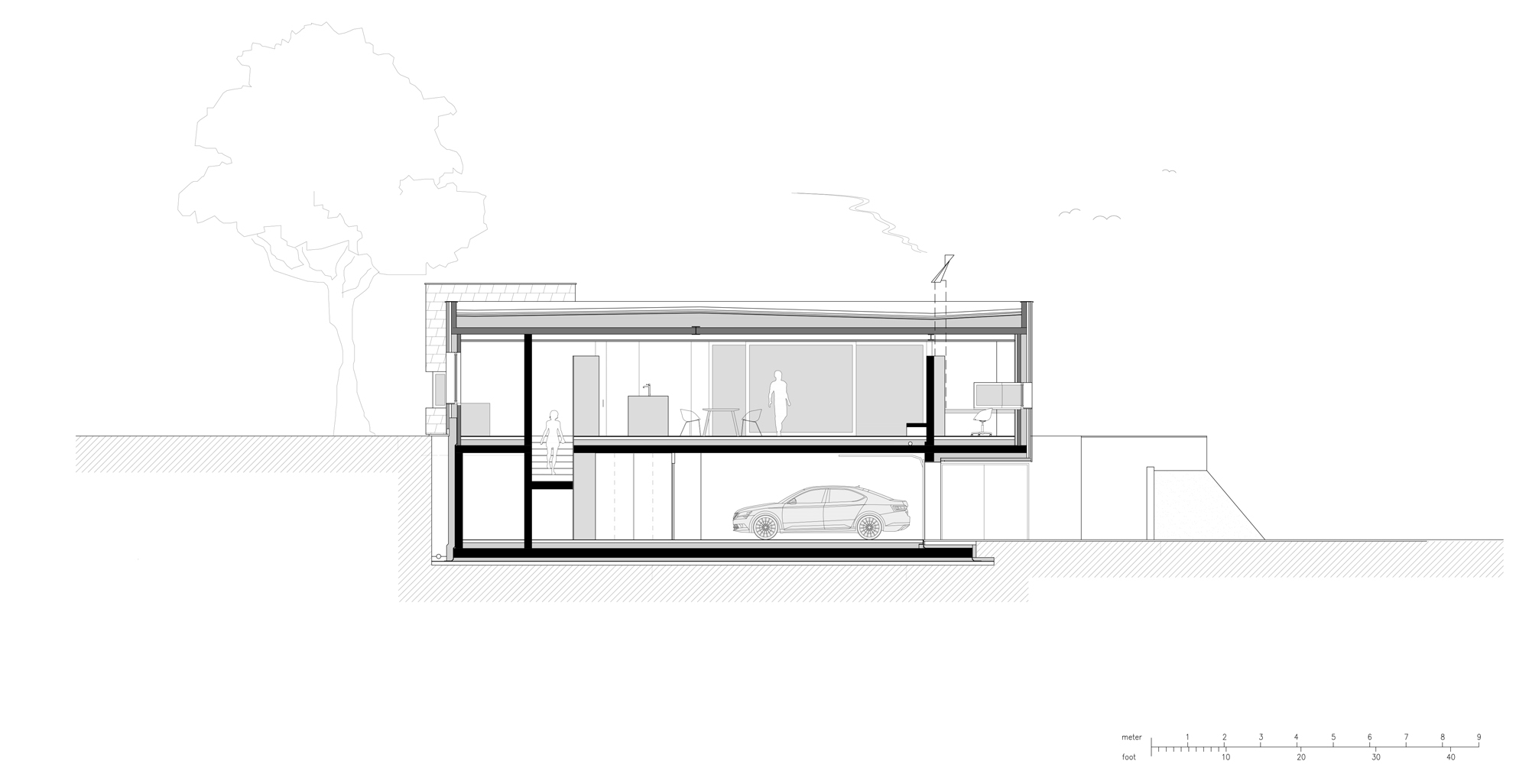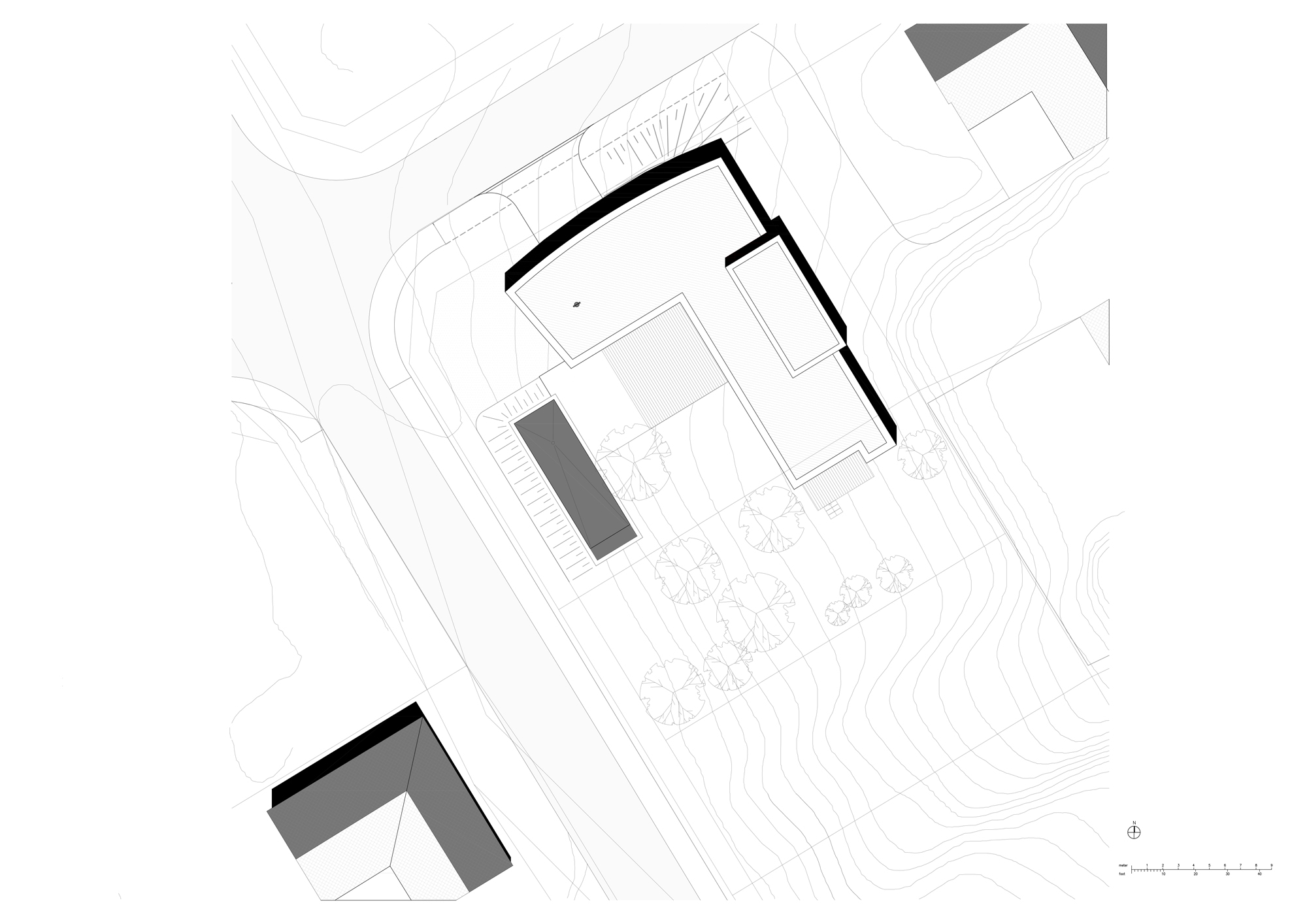 Arhitekti so pri snovanju hiše sledili blagemu nagibu terena in projekt razvijali od spodaj navzgor. Tako je nastala uvodna poteza hiše, ki jo označujejo glavni vhod z ulice in v teren vkopani pomožni prostori.