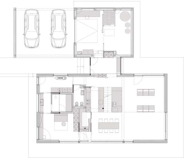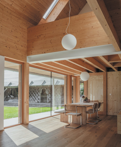 Hiša je, čeprav na prvi pogled ni videti tako, velika. Poleg bivalnih prostorov, spalnic (spalnica za starše in tri otroške sobe) z vsemi pripadajočimi kopalnicami in garderobami ter servisnih prostorov ima še manjši wellness, študijski kabinet, delavnico, shrambo za športno opremo in nadstrešnico za dva avtomobila. Arhitekta sta program razporedila v dva med seboj povezana stavbna volumna. Nastala je kompozicija, ki od daleč spominja na tradicionalne podeželske hiše, od blizu pa ponuja razgiban prostor za sodoben način bivanja.