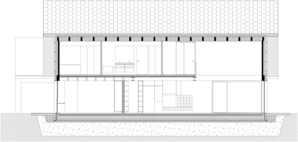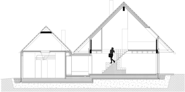 V središču hiše je, kot se spodobi, ognjišče. Okoli njega so v pritličju nanizani bivalni prostori, ki se prek prostranih panoramskih oken odpirajo k naravi. V nadstropju so nanizane spalnice oz. otroške sobe. Celotni volumen pa »prebada« praznina, ki vertikalno povezuje obe etaži in se konča v majhni galeriji pod slemenom strehe. Namenjena je igri otrok.