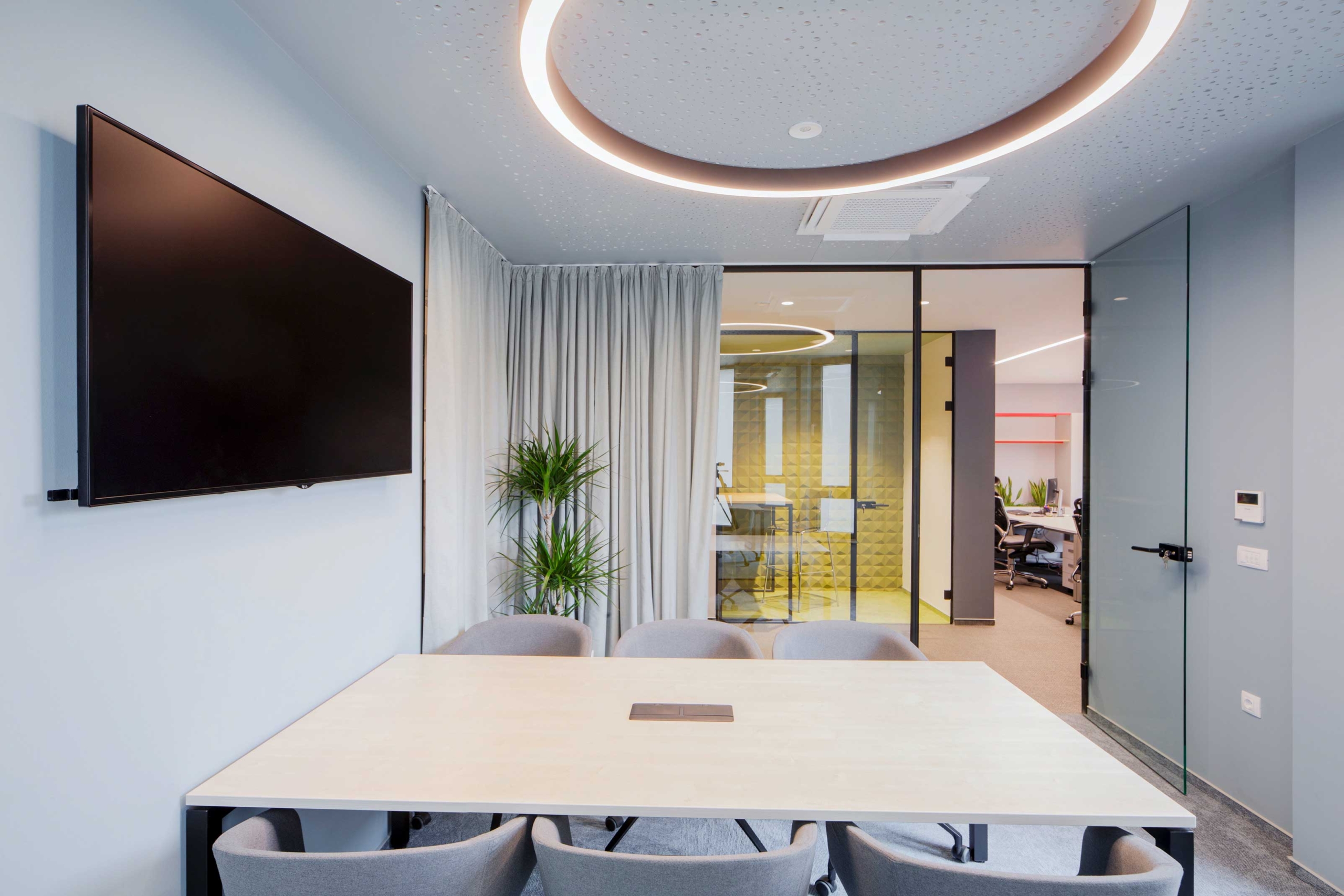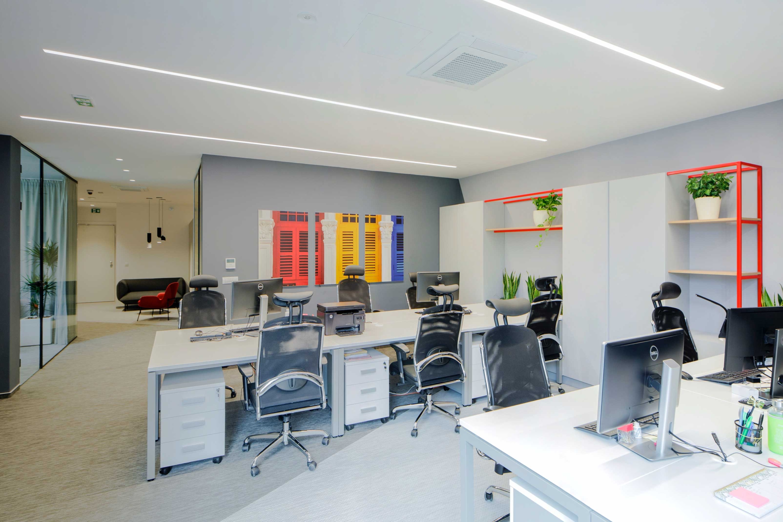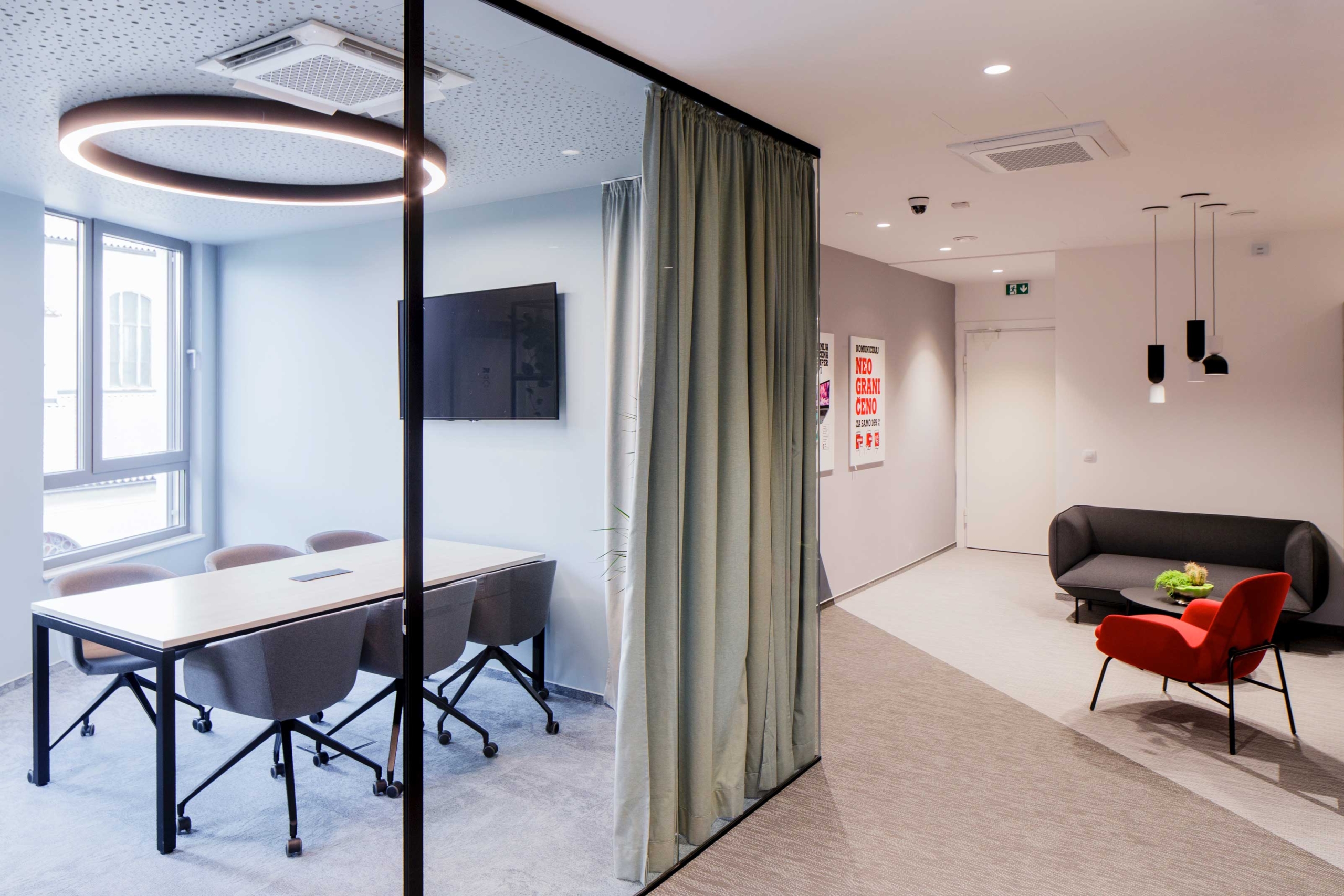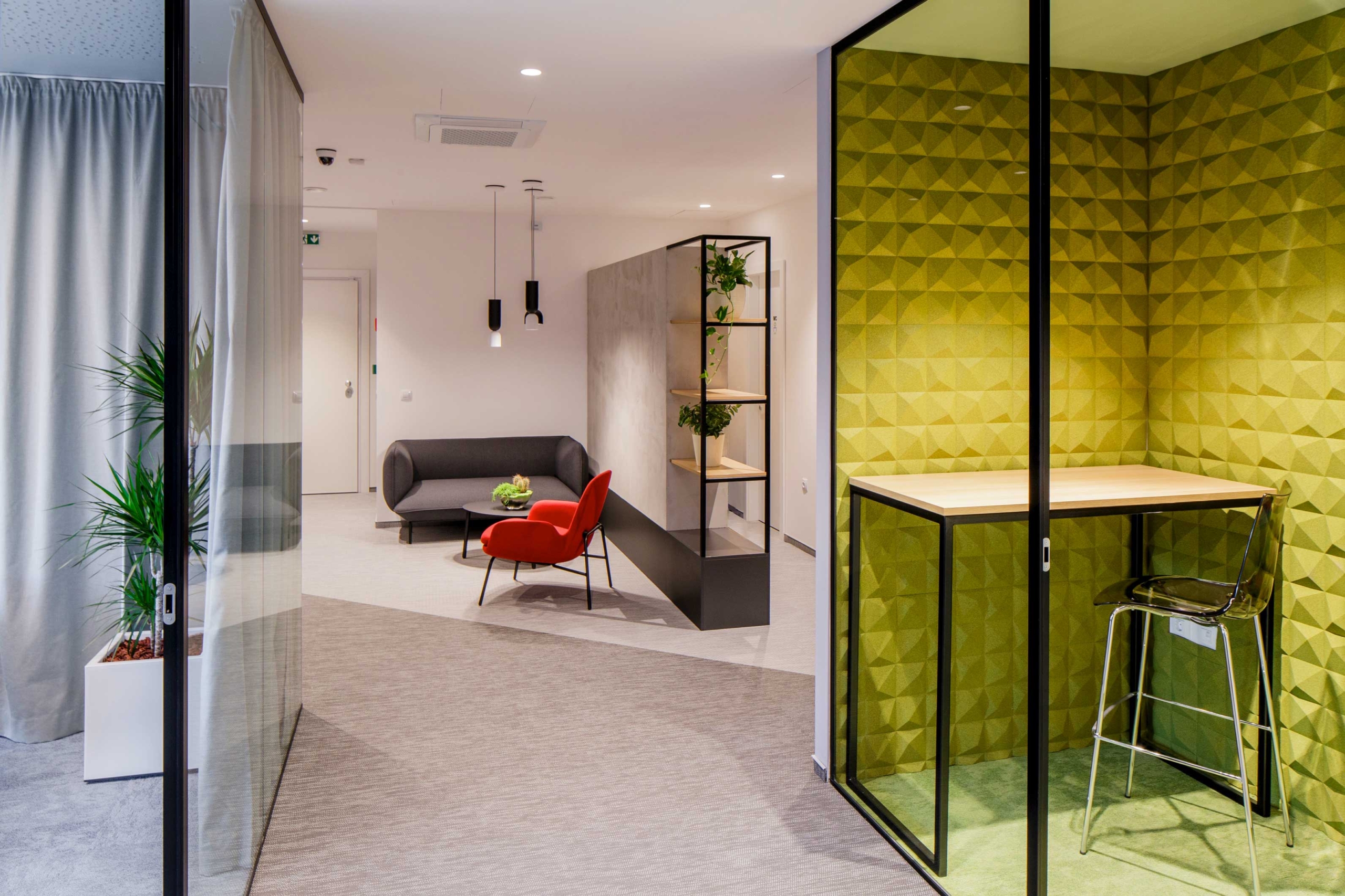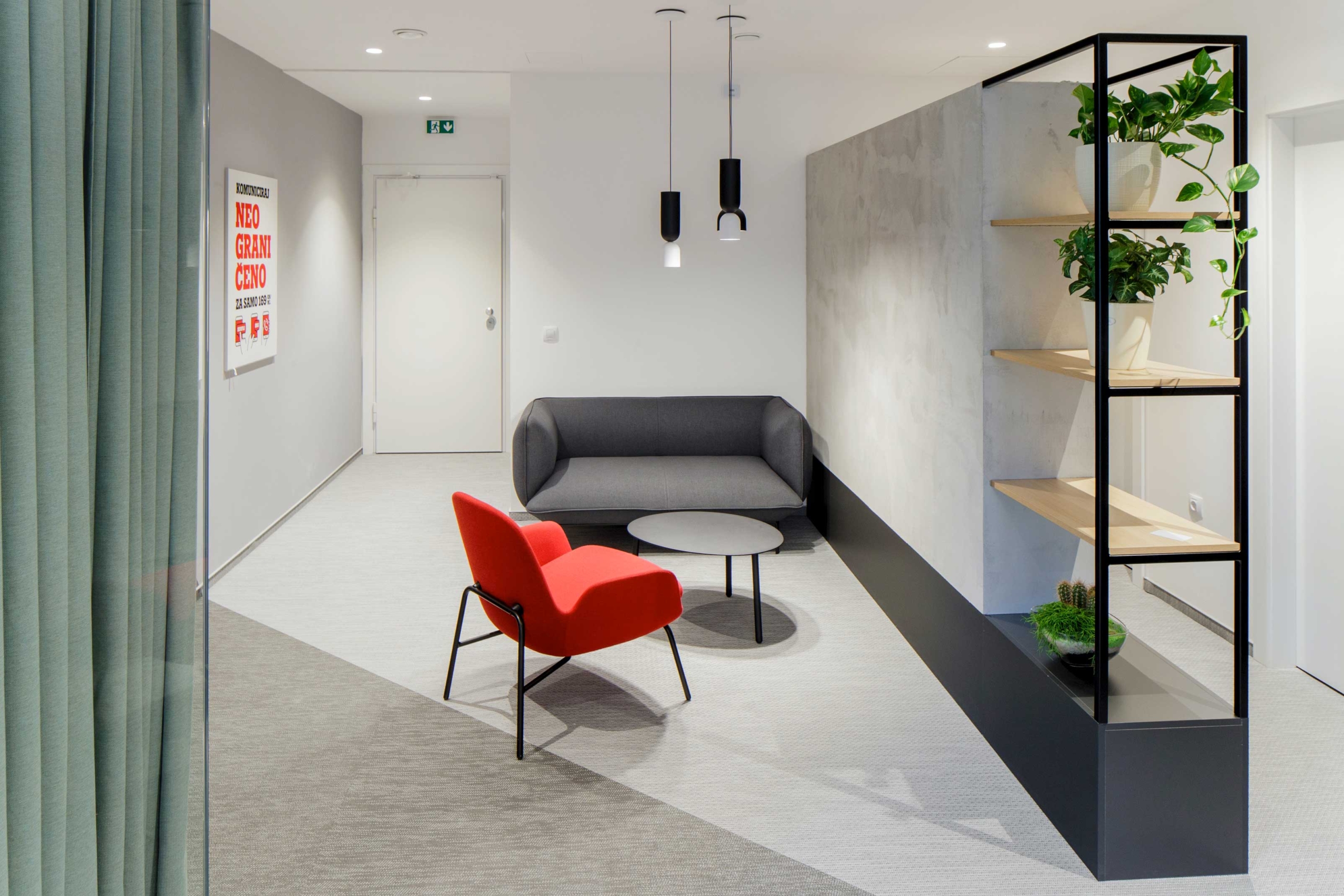 „Kljub fizični razdalji med sedežem podjetja in regionalno pisarno smo uspeli ustvariti občutek povezanosti in pripadanja med zaposlenimi, tako da se vsi počutijo domače in sprejeto, ko obiščejo katerokoli izmed pisarn,“ povedo arhitekti. Interier v nevtralnih tonih in jasnih linijah tu in tam prekinjajo živahne barve in teksturirane površine. Rdeča kuhinja, modra sejna soba in zeleni kotiček za video klice so usklajeni s celostno podobo podjetja, ki temelji na barvni kombinaciji rdeče, modre in zelene. V pisarnah je zaradi pregradnih zasteklitev obilo svetlobe, več zasebnosti v sejni sobi pa lahko zaposleni dosežejo s sivimi zavesami.