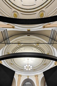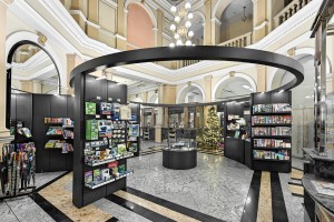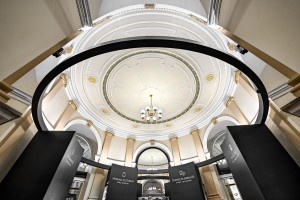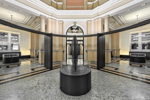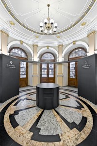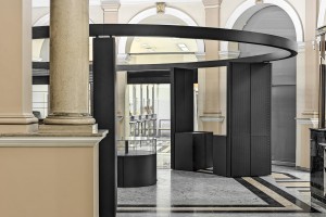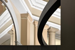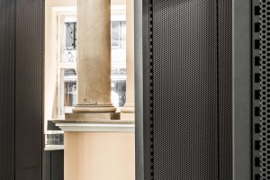 Umestitev dokaj obsežnih novih funkcij v razgiban in občutljiv historicistični interier zahteva tankočuten pristop. Na internem natečaju, ki ga je razpisala Pošta Slovenije, so prvo nagrado prejeli in pred kratkim tudi izvedli BAAM arhitekti: Blaž Jamšek, Andrej Zonta in Matej Peneš. Ker je enako kot fasada varovan tudi historični interier, je bilo za projekt ključno tesno sodelovanje z Zavodom za varstvo kulturne dediščine. Projekt je do konteksta pristopil skoraj urbanistično, kar je glede na različna križanja in zgoščevanja poti obiskovalcev v vogalu stavbe smiselno in v sozvočju z izvorno funkcionalno zasnovo objekta. Zagata ohranjanja koherence starega in jasna ločitev od novega je bila glavno vodilo pri enotnem oblikovanju vseh novih elementov v kontrastni črni barvi in materialu: perforiranih oziroma polnih kovinskih elementov.