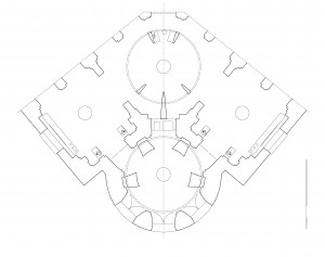 Nova interpolacija je oblikovana kot dve zaključeni enoti. Prva, umeščena v vogalni predprostor oziroma vetrolov, je 24 ur odprta in avtomatizirana postaja, ki je zaradi vključenih obsežnih avtomatov bolj masivna. Druga, umeščena v osrednjo večnadstropno avlo, je lažja in bolj igriva prodajno-informativna postaja. Vsako izmed njiju v celoto povezuje krožnica, ki jo morda lahko beremo kot sodobno interpretacijo renesančnega načela, da je raznolike in nepravilne prostore najelegantneje nevralizirati s krogom. In kot nevtralizacijo moramo brati tudi nove posege na Pošti – pri tem pa je treba opozoriti, da nevtralizacija tu ne pomeni tudi brezkarakternosti. Če sta material in oblikovalski jezik zadržana in se umikata bogatemu historicističnemu okvirju, pa dvojna krožnica ne poskrbi le za kontekstualizacijo novih posegov, ampak tudi za smiselno koherenco in enotnost nove oblikovalske poteze.