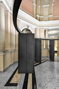 Umestitev dokaj obsežnih novih funkcij v razgiban in občutljiv historicistični interier zahteva tankočuten pristop. Na internem natečaju, ki ga je razpisala Pošta Slovenije, so prvo nagrado prejeli in pred kratkim tudi izvedli BAAM arhitekti: Blaž Jamšek, Andrej Zonta in Matej Peneš. Ker je enako kot fasada varovan tudi historični interier, je bilo za projekt ključno tesno sodelovanje z Zavodom za varstvo kulturne dediščine. Projekt je do konteksta pristopil skoraj urbanistično, kar je glede na različna križanja in zgoščevanja poti obiskovalcev v vogalu stavbe smiselno in v sozvočju z izvorno funkcionalno zasnovo objekta. Zagata ohranjanja koherence starega in jasna ločitev od novega je bila glavno vodilo pri enotnem oblikovanju vseh novih elementov v kontrastni črni barvi in materialu: perforiranih oziroma polnih kovinskih elementov.