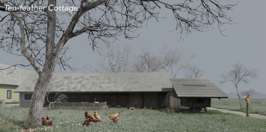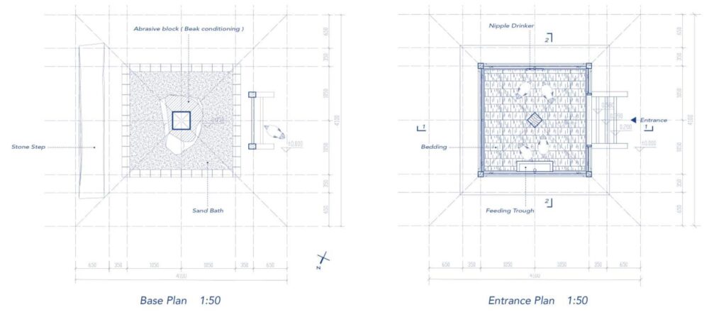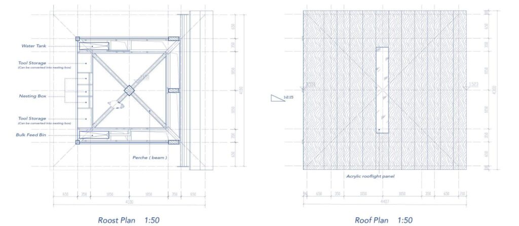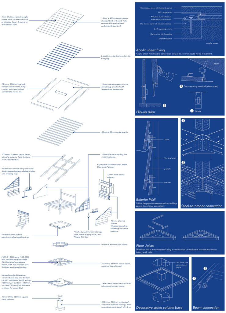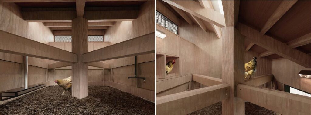 Architecture ceases to be a mere container for chickens. Instead, it becomes a physical manifestation of their innate behaviors—the chickens do not merely “use” the building, but “inhabit an amplified version of their own instincts.” The interior space is fully optimized for the comfort of ten hens. Key features, including perches with an effective length exceeding 3.5 meters (deducted perches that are spaced too closely or have insufficient clearance above), and two utility storage cabinets that can be converted into additional nesting boxes, enable potential expansion of the flock to its maximum capacity.