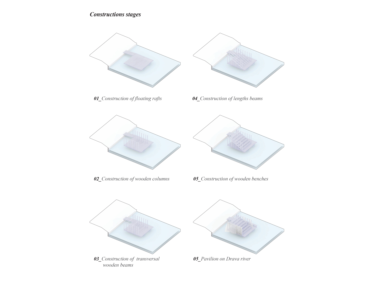 Predlog plavajočega paviljona na reki Dravi, zasnovan kot poševnina, ki zamejuje in oblikuje praznino, odpira in povezuje robove reke in mesta. Lahka, dematerializirana fasada obdaja modularno leseno strukturo, ki vsebuje prilagodljive in raznolike programe. S tem želi paviljon ustvariti trezno, transparentno in sodobno podobo za mesto Maribor.