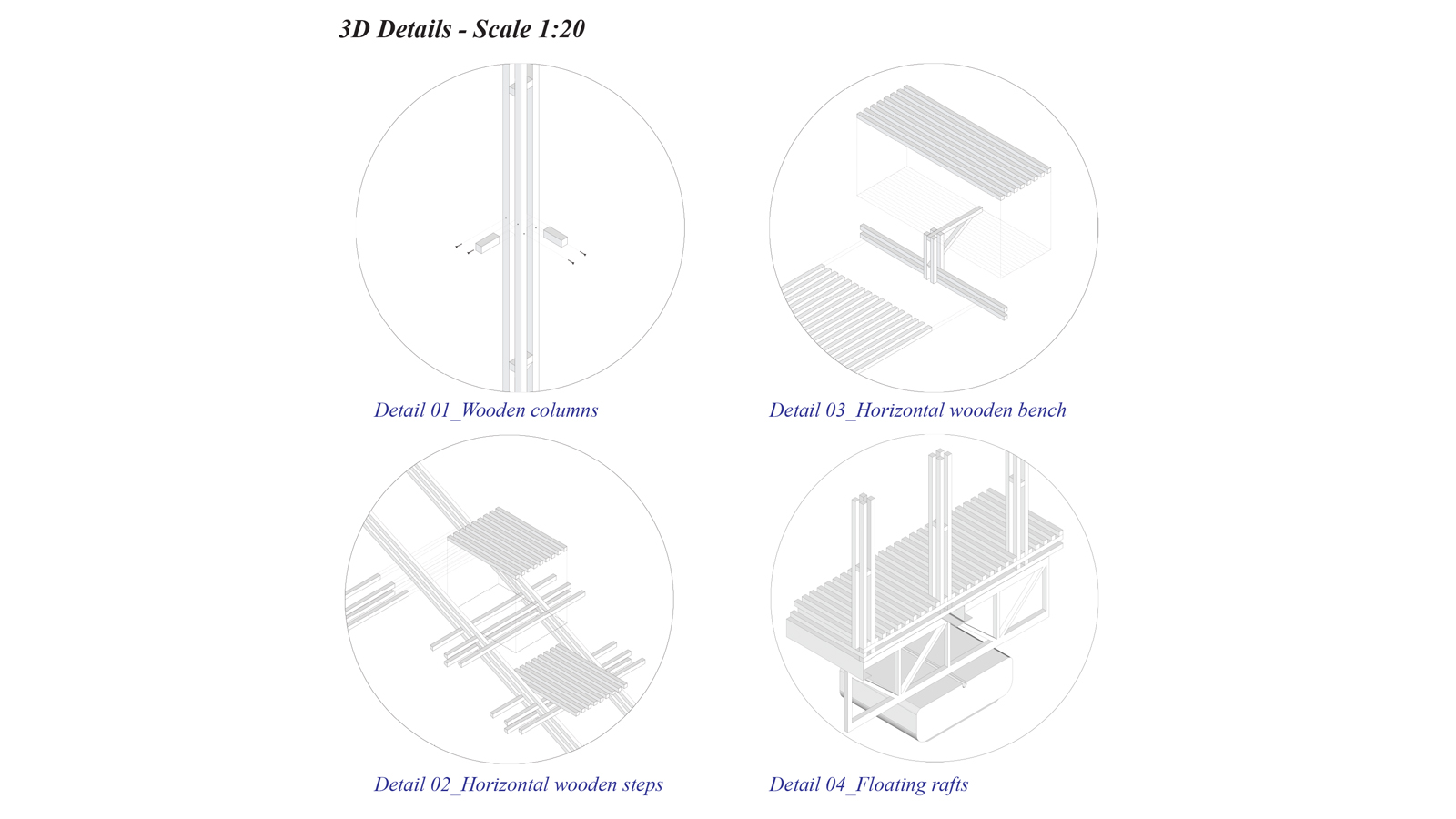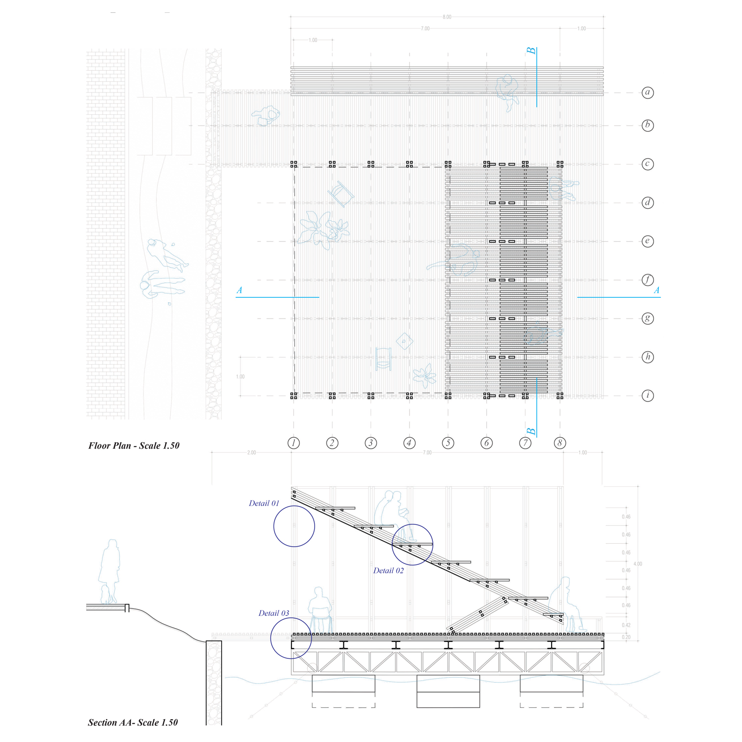 - Program: Predlog uporablja ploščad 8 × 8 metrov, ki omogoča prilagodljiv, prepusten, nenehno spreminjajoč se prostor, ki lahko gosti več dejavnosti čez dan. Njena streha, ki deluje kot galerija, omogoča ljudem, da opazujejo vedute in se obenem udeležujejo dejavnosti, ki paviljon povezujejo z reko.