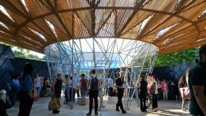 Paviljon je že od pamtiveka objekt idealnega arhitekturnega eksperimenta; bolj ali manj efemerna tipologija, na kateri so arhitekti najraje preizkušali tehnološke invencije in teoretske koncepte, preden so jih uvedli tudi drugod. Kéréjev paviljon si za jedro svojega eksperimenta namesto materialov in izvedbe izbere skupnost: kako arhitektura v metropolitanskem londonskem kontekstu vpliva na druženje, na pripovedovanje zgodb, na deljenje izkušenj, na družbenost. Celo, kadar večino obiskovalcev sestavljajo samo arhitekturni in umetnostni navdušenci, ki s svojimi fotoaparati iščejo instagram prizore in lepo izvedene detajle, stavbi s svojo introvertirano in vendar lahkotno ter svetlo zasnovo uspe oblikovati sintezo, ki je več kot samo seštevek človeških teles v njej, ki se začnejo zavedati drugo drugega. To je njen družbeni uspeh. Torej eksperiment kaže, da je gradnja bolj organsko povezane skupnosti celo v takem človeškem mravljišču, kot je London, s pomočjo pristnejših, bolj nedolžnih življenjskih izkušenj vendarle mogoča? Morda: vendar pa ne pozabimo, da ob obisku tople in udobne, obenem pa še lepe strukture nismo niti dva kilometra oddaljeni od ožganega skeleta stolpnice Grenfell, kjer se je ideja skupnosti izkazala za poraženo oziroma v najboljšem primeru popolnoma ločena od načeloma največje skupnosti: države. Vsak večer ob šestih se vrata paviljona zaprejo, po častitljivi angleški navadi pa pred večerom zapahnejo tudi parkovno ograjo, ki obdaja kompleks Serpentine. Zdi se, kot da smo idejo skupnosti sposobni doživljati le še kot posebnost, kot eksotično idejo od daleč, za nedeljski piknik sem ter tja. Ampak to je pač prekletstvo vsakega paviljona. Če pa bi razkorak med svojo majhno utopijo in veliko distopijo, ki ga obkroža, uspel še bolj neposredno artikulirati, pa bi bil to lahko tudi njegov veliki uspeh.