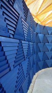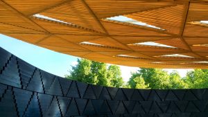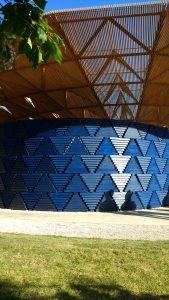 Francis Kéré je paviljon oblikoval kot krožno strukturo z lebdečo konzolno streho na jekleni konstrukciji, ki se spušča proti centru zasnove. Tam, kjer bi morda pričakovali ognjišče, se konstrukcija ustavi ob v nebo odprt okulus. Sem se steka tudi vsa voda iz obsežne strešne površine, ki je v Londonu poleti ni tako zelo malo. Elegantna šotorska streha zaradi osrednjega »debla« in lesenih letvic spominja na drevo (Kéré jo je zares zasnoval kot spomin na osrednje drevo afriških vasi, pod katerimi se zbirajo vaščani). Streho obkrožajo gibko zaviti nizki zidovi iz modularnih modrih lesenih blokov, ki sestavljajo navznoter gladko, zunaj pa reliefno slikovito indigo teksturo. Intenzivni barvi sten in strehe sestavljajo presenetljivo umirjeno celoto. Še posebej izvirna je perforacija sten in strehe: zdi se, da je, kot bi bila slamnata, povsod luknja pri luknji, odprtina pri odprtini, svetloba ob svetlobi, in vendar nas ne zapusti občutek, da smo zaščiteni pred zunanjostjo. Stene so prestreljene z režami, pa smo vendar zaščiteni pred pogledi. Kot da bi bila izkušnja naravnega drevesnega zatočišča končno enkrat prevedena v arhitekturo s sodobnimi metodami in izraznim jezikom.