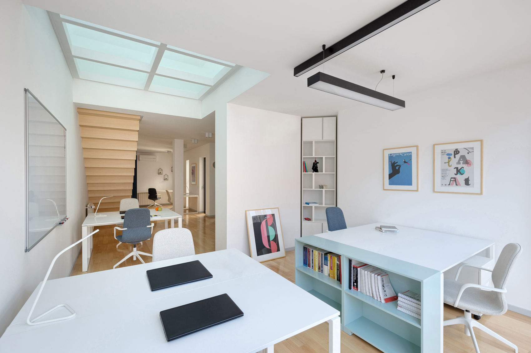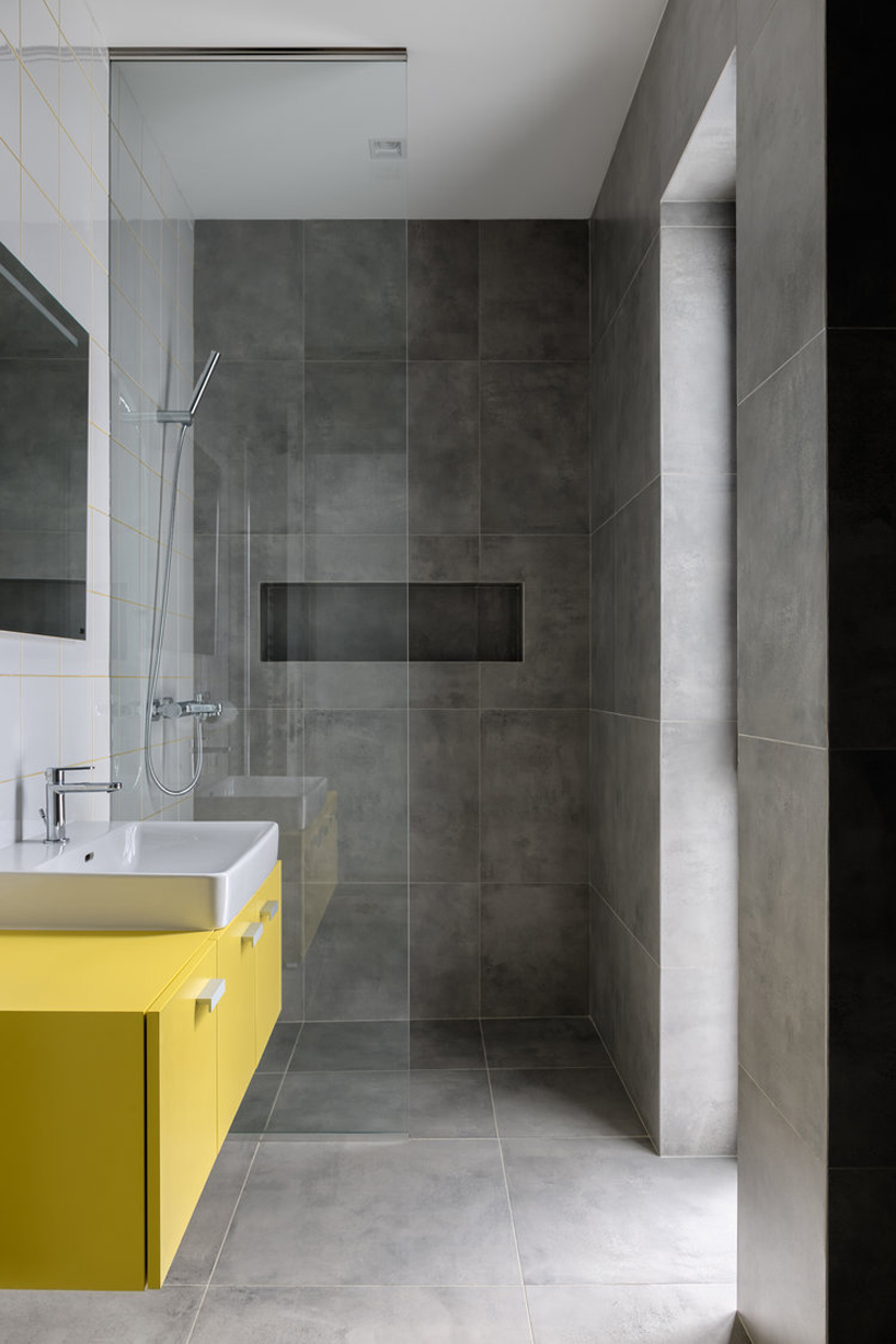 Deli steklenih sten so obarvani rumeno, s čimer se povezujejo s spodnjo fasado in ohranjajo glavne vertikalne linije. Dodaten poklon svetlobi predstavljajo strešna okna, skozi katera naravna svetloba seže vse do spodnje etaže dvoetažnih stanovanj, saj so tudi tla v interierju mestoma prebodena s svetlobniki. Interier je v spodnjem nadstropju zasnovan kot pretočen večfunkcionalen prostor, ki v zgornjem nadstropju zadobi nekaj več intime in zasebnosti z ločenimi sobami. Te so med seboj povezane s prostorno zunanjo teraso.