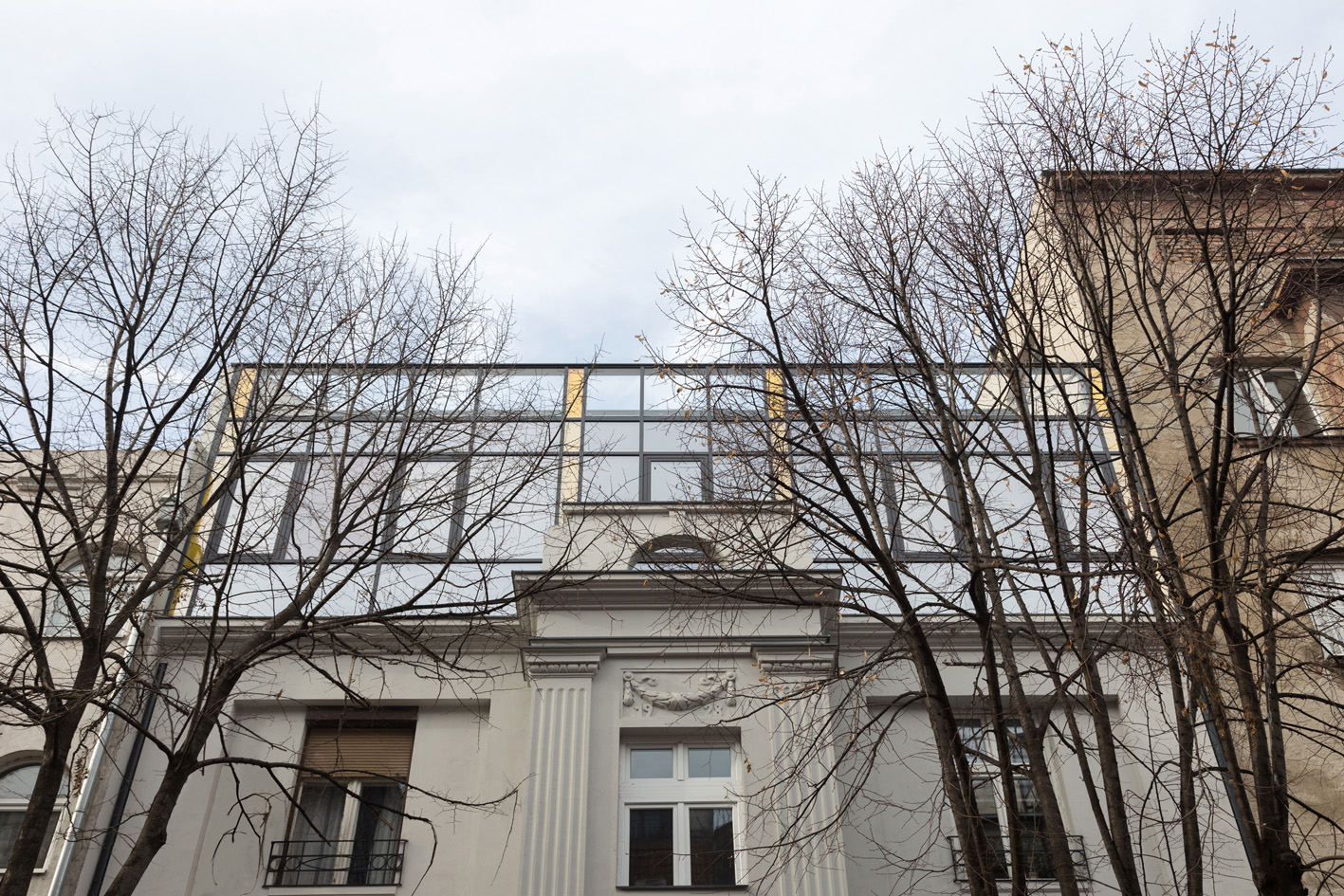 Arhitekta Ela Nešić in Danilo Nedeljković sta v Beogradu zasnovala nadgradnjo obstoječe meščanske stavbe z dvema stanovanjema. Novi del, ki je dodan nad obstoječo fasado, ubira oblikovno povsem lastno pot in deluje kot steklen kubus, ugreznjen v ponujeno odprtino. Namesto da bi bila pretirano moteča, nova intervencija izkazuje tendenco po dematerializaciji. Odločitev za velike steklene površine pa ni imela le estetskih, temveč tudi funkcionalne vzroke. Stavba je namreč orientirana na sever in ima dostop do naravne svetlobe le od zgoraj in s sprednje strani.