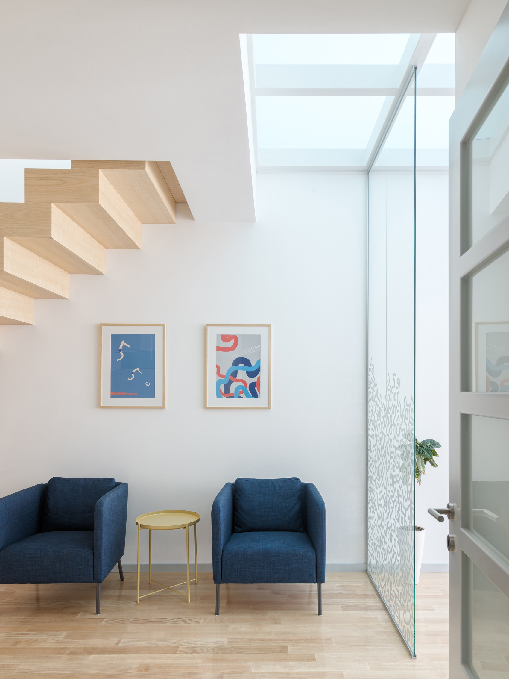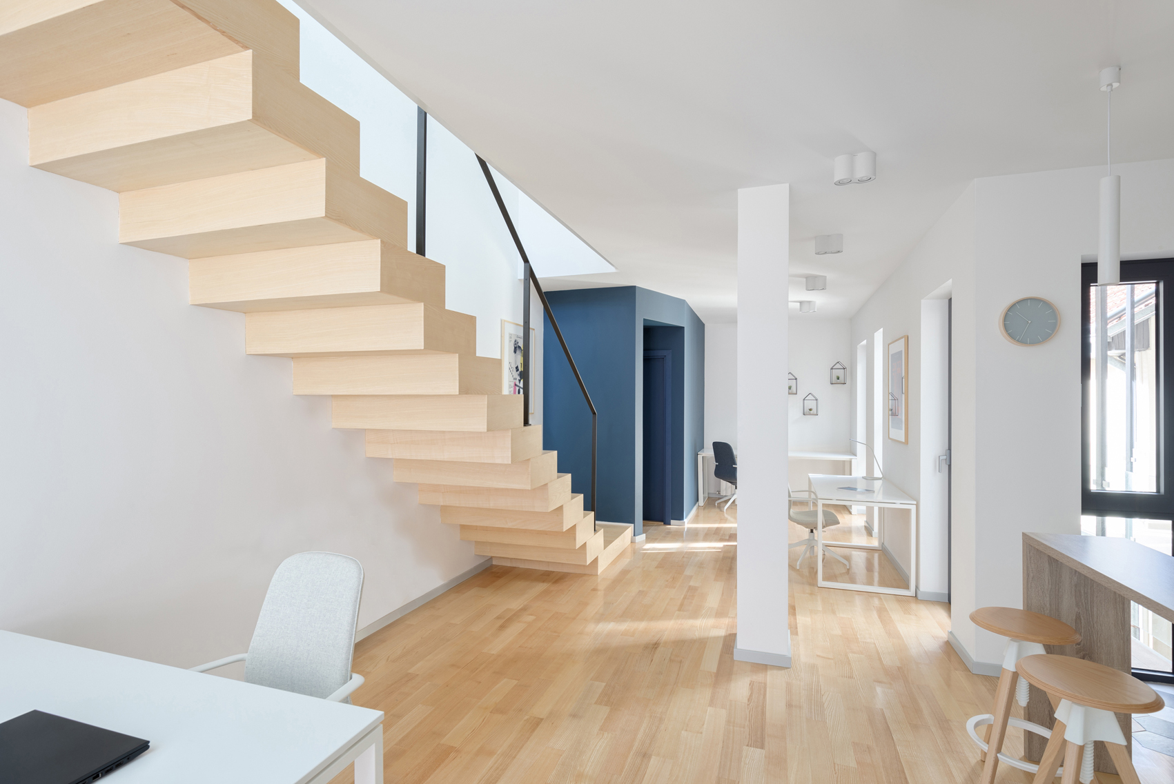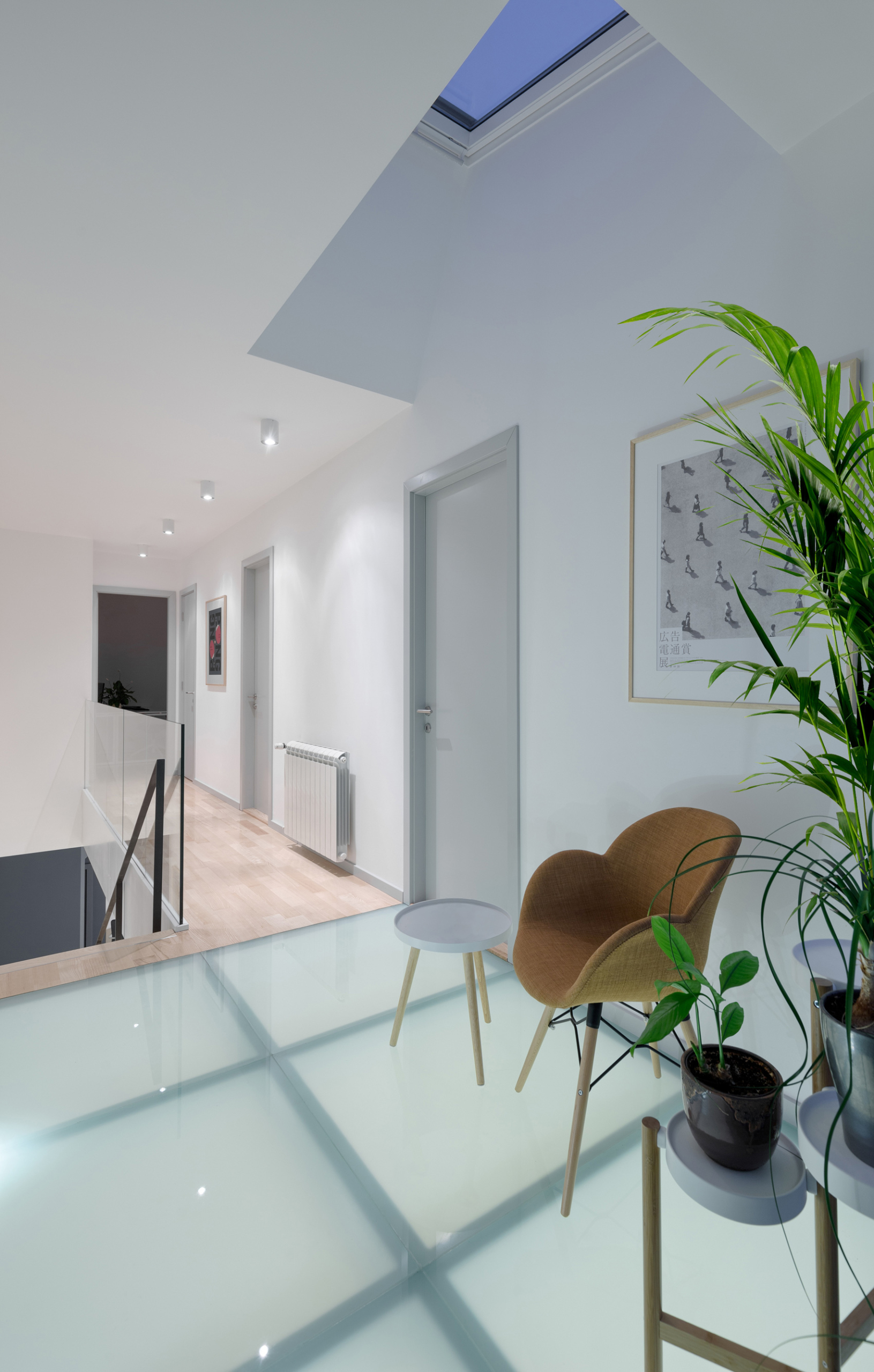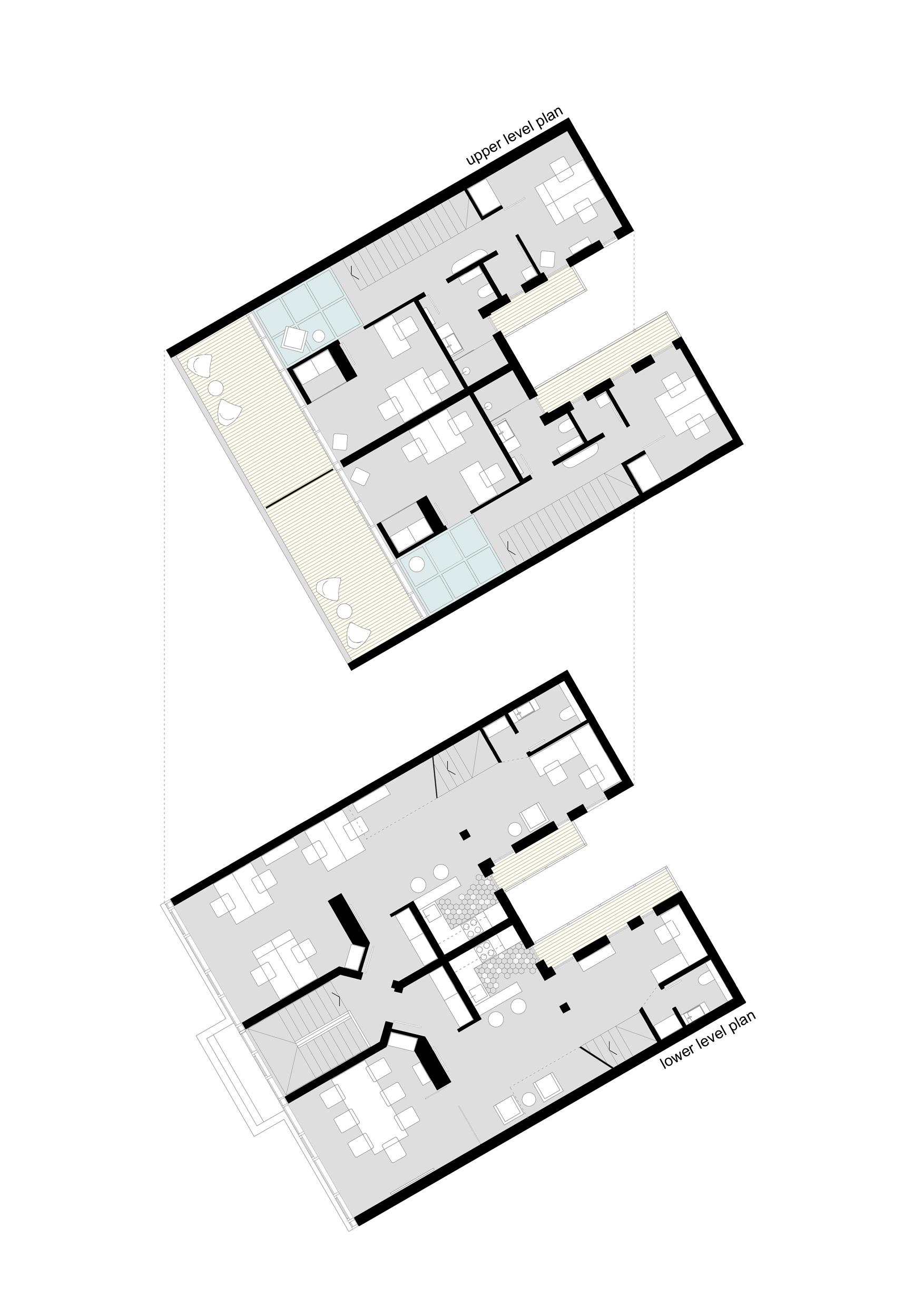 Deli steklenih sten so obarvani rumeno, s čimer se povezujejo s spodnjo fasado in ohranjajo glavne vertikalne linije. Dodaten poklon svetlobi predstavljajo strešna okna, skozi katera naravna svetloba seže vse do spodnje etaže dvoetažnih stanovanj, saj so tudi tla v interierju mestoma prebodena s svetlobniki. Interier je v spodnjem nadstropju zasnovan kot pretočen večfunkcionalen prostor, ki v zgornjem nadstropju zadobi nekaj več intime in zasebnosti z ločenimi sobami. Te so med seboj povezane s prostorno zunanjo teraso.