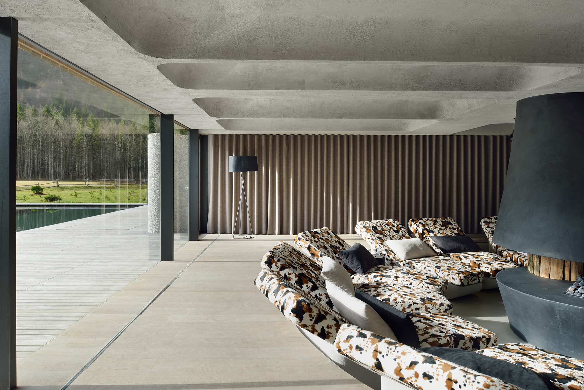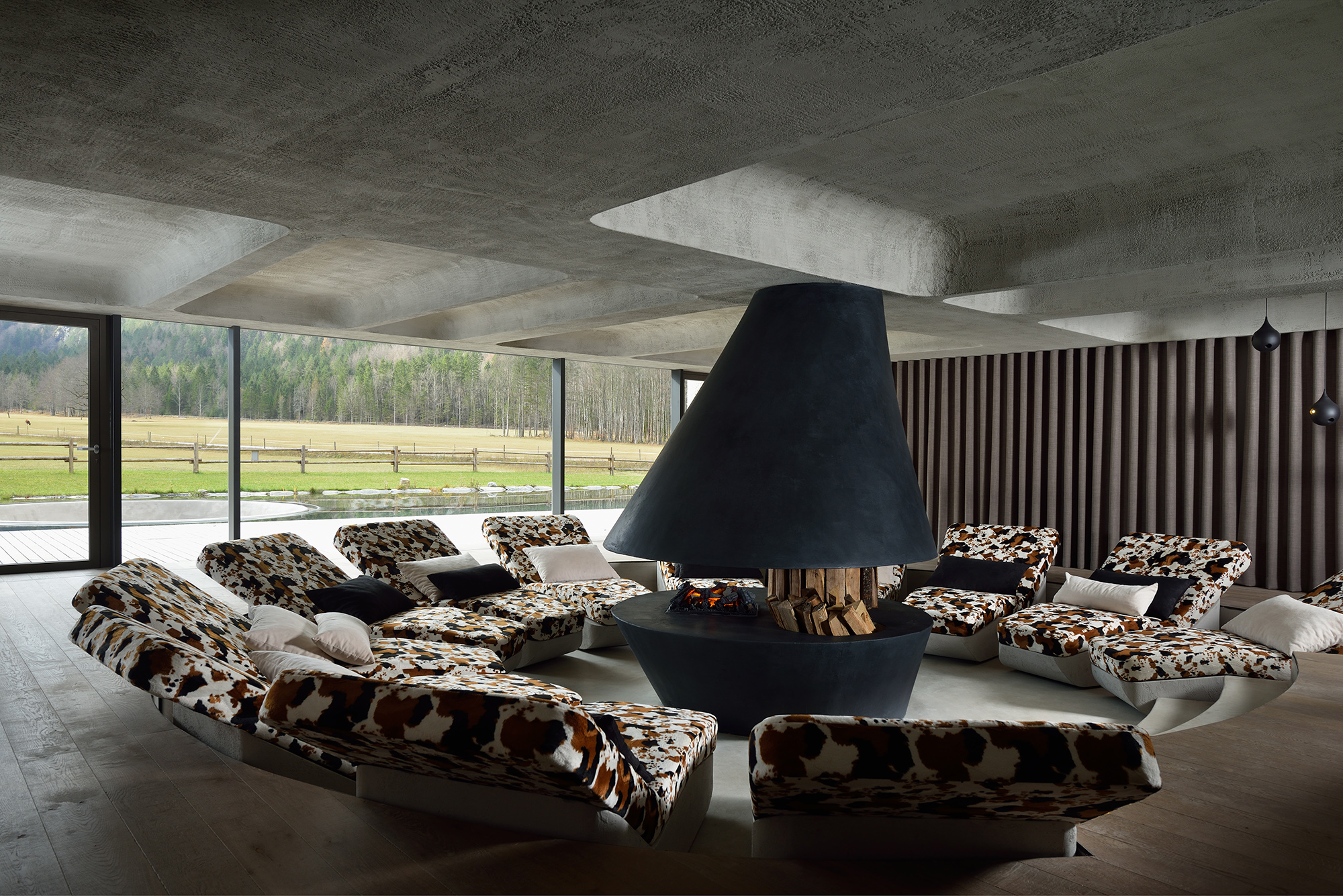 Arhetipsko podobo ognjišča, okoli katerega se zbira skupnost, in ki v zavest kliče prvinsko domačnost in varnost, so arhitekti v projektu udejanjili kar dvakrat: enkrat v notranjosti, kjer okroglo notranje počivališče s kuriščem v sredini, ter drugič zunaj, ko so v volumen bazena, na gladini katerega odsevajo gorski grebeni, zarezali poglobljeno krožno sedišče, sredi katerega se prav tako dviguje ognjišče. Obiskovalci lahko tako v kontemplativnem vzdušju uživajo v čudovitem razgledu in družbi kontrastnih elementov vode in ognja.