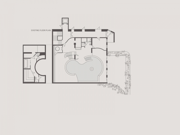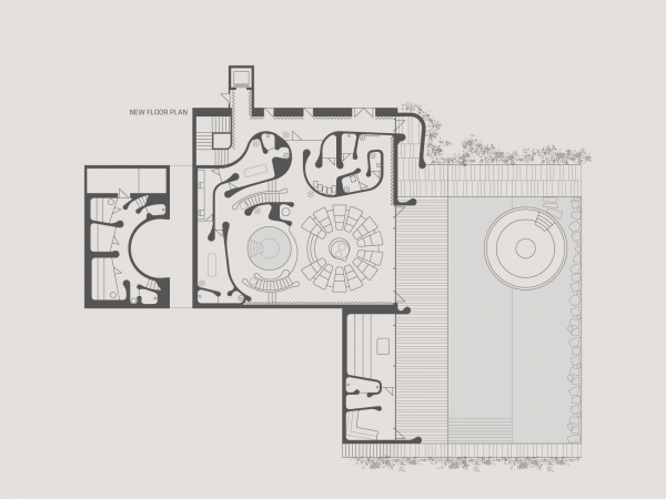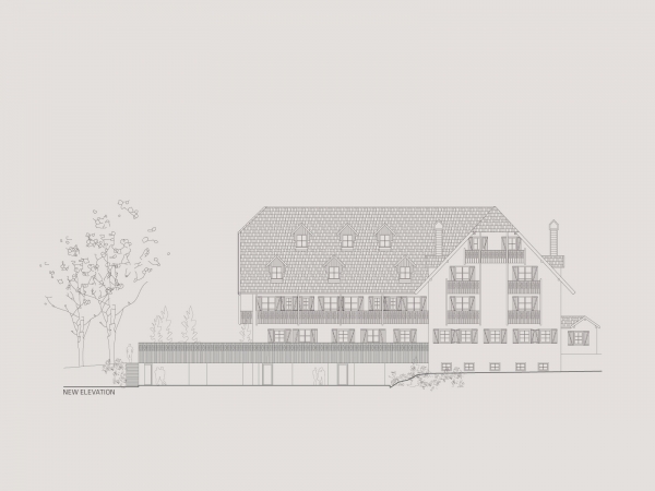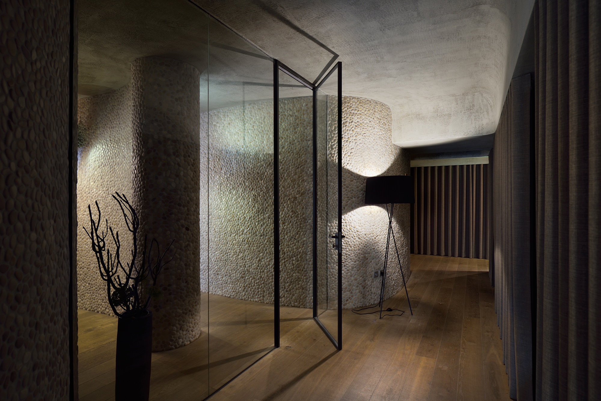 Sproščena postavitev notranjih delitev zaobjame ter zakrije vse te nepravilnosti in ustvari fluiden prostor, ki se izteče v dolino. S prodniki obložene stene prostora tudi fizično preidejo v zunanjost in optično delijo sončno teraso na del, namenjen zunanji savni, del namenjen osrednjemu prostoru wellnessa in vhodni portal. Fasada med delitvami je v celoti steklena in nadomesti obstoječa ločna okna. Povečanje fasadnih odprtin wellnessa dodatno poveže notranji prostor s slikovito zunanjostjo in kljub razširitvi osnovnega volumna zmanjša njegovo prisotnost v prostoru. Očiščenje prizidka vseh poudarjenih arhitekturnih elementov ga, bolj kot z objektom, poveže z okoliškim terenom.