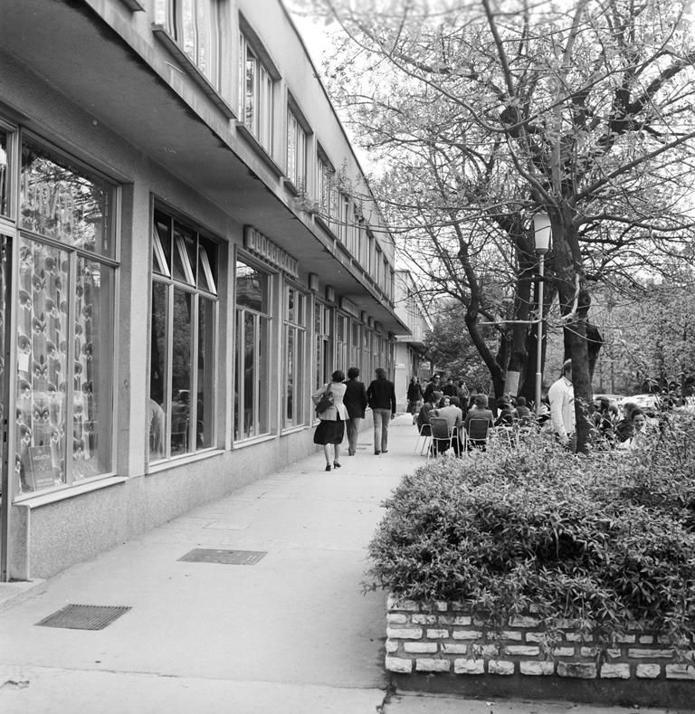 Mediteranski pristop k uživanju v javnem parterju mesta se je izražal že od začetka izgradnje Nove Gorice. Za trgovine v stavbah na Delpinovi ulici je avtor arhitekt Teodor Lojk v tehničnem poročilu celo zapisal, da naj »ne bi imele posebnih običajnih izložbenih oken, ampak bi trgovine kot celota bile že istočasno tudi izložbe.« Arhitekt je predvidel pohajkovanje in ogledovanje izložb na način, da cela trgovina postane izložba in tako del ulice in javnega prostora.