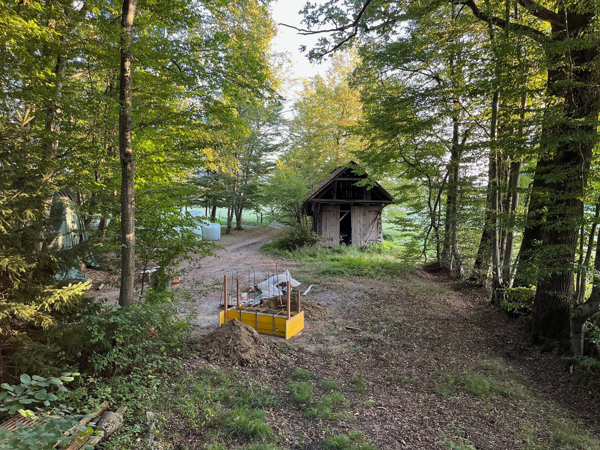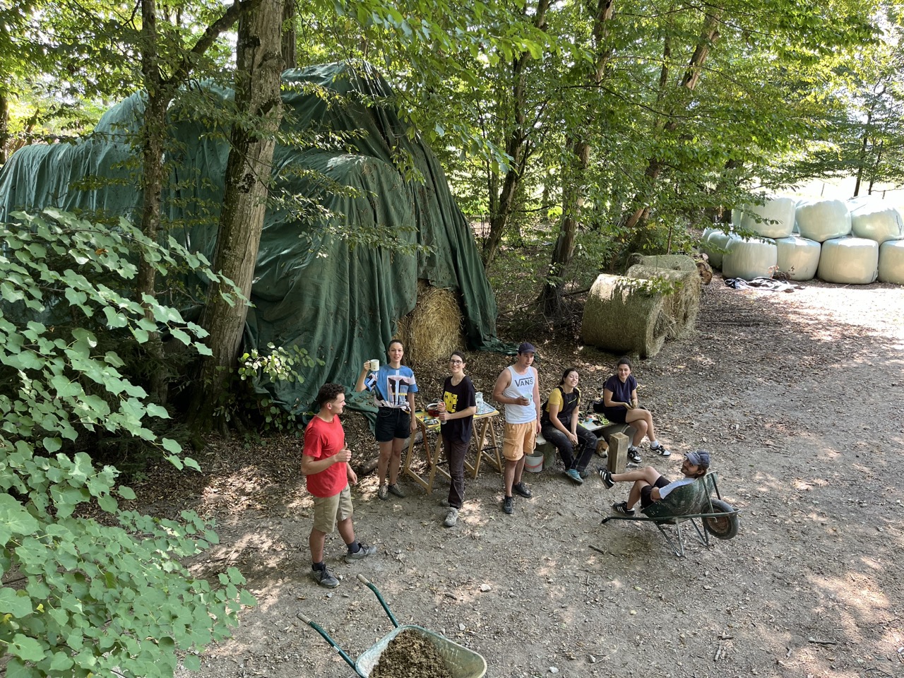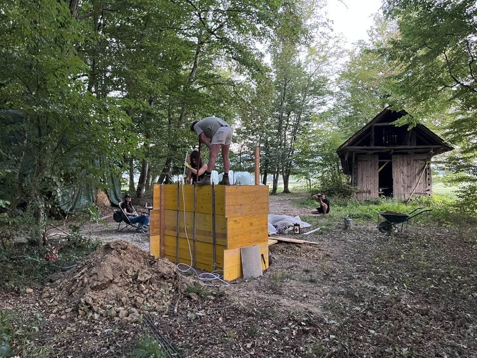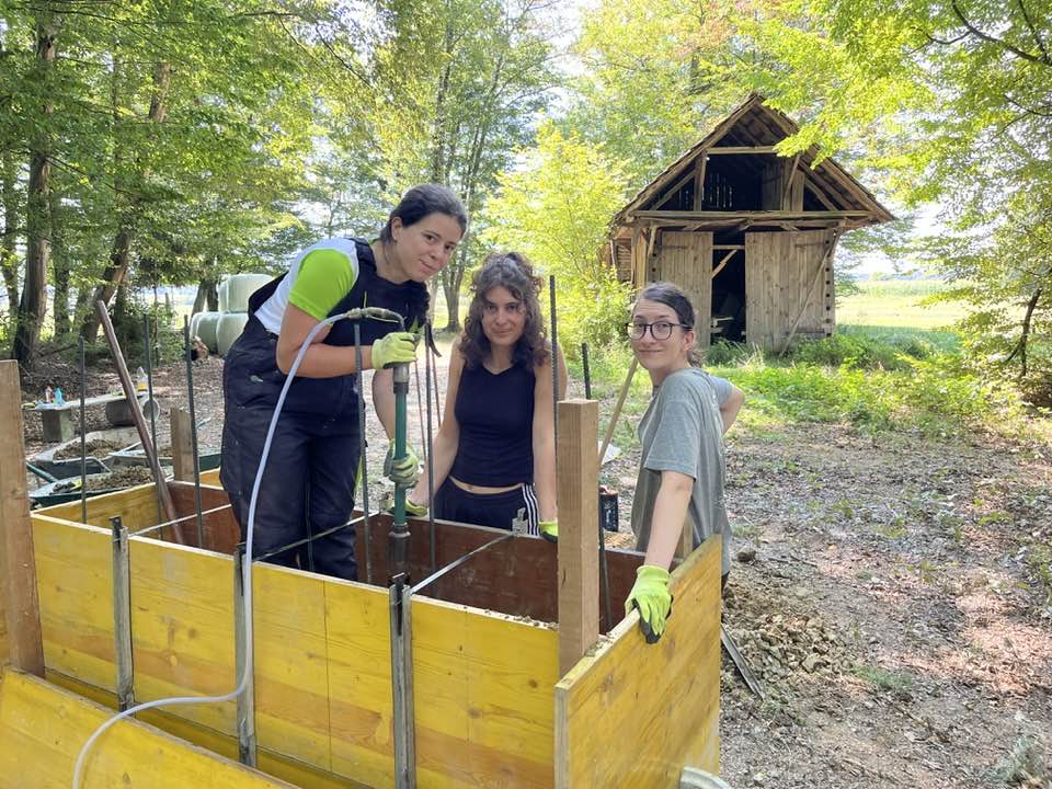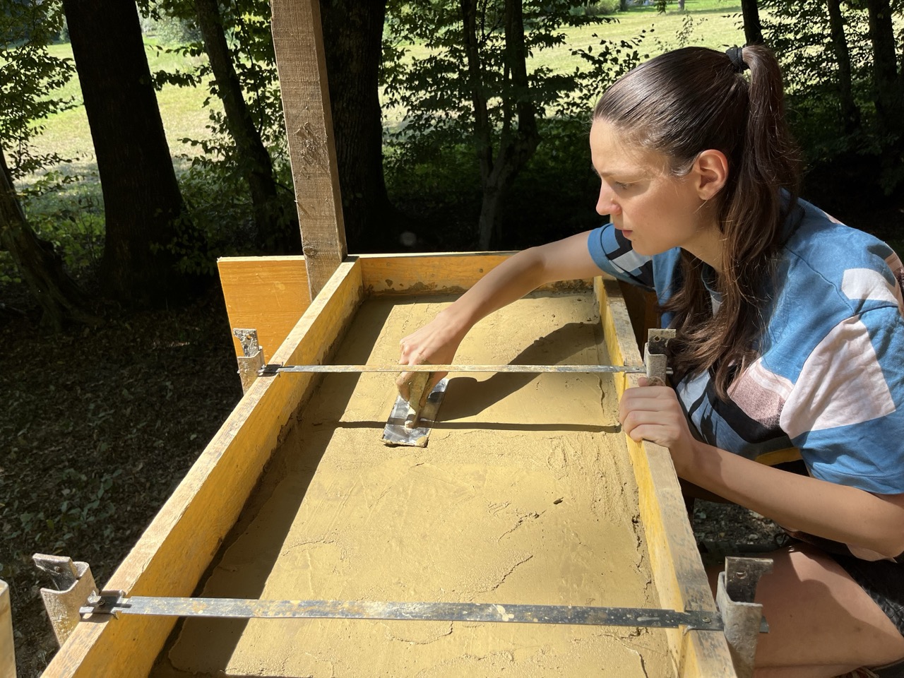 Dopoldne smo z bagrom pripravili izkop za temelje in ločili humus od ilovice, ki je bila pripravljena za uporabo pri gradnji. Analizirali smo sestavo zemlje ter pod vodstvom Kinge Gacsályi izvedli delavnico priprave ilovnatih ometov. Udeleženci so izdelali različne vzorce z dodatki mivke, slame in kokosovih vlaken. Popoldne smo vlili temelje novega paviljona, večer pa zaključili ob ognju, s pečeno koruzo, kopanjem v Krki in spanjem na seniku.