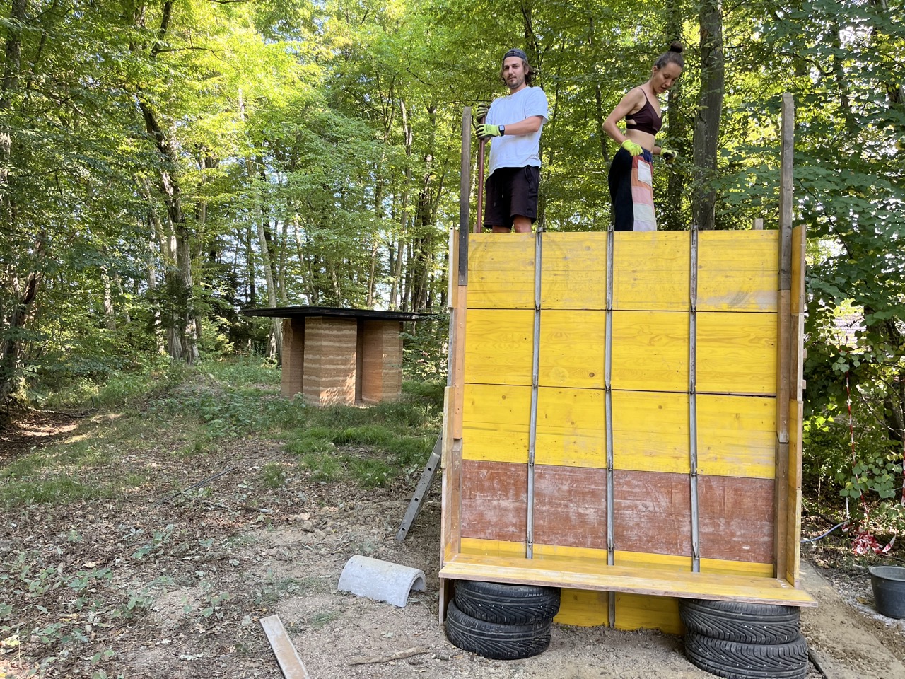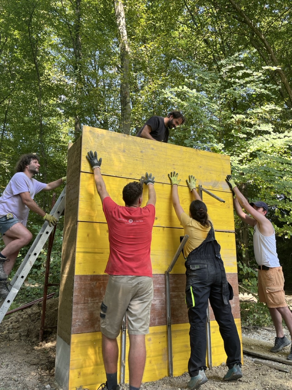 Delo se je prevesilo v sklepno fazo. Nadaljevali smo z mešanjem in zbijanjem ter postopoma dvigali zid do želene višine 2 m nad betonskim podstavkom. Skupna višina zidu je dosegla 2,4 m. Zgornjo površino smo skrbno izravnali, nato pa pričeli z razpiranjem opažev. To je bil eden najbolj vznemirljivih trenutkov tedna – ko se pred očmi vseh pokaže rezultat skupnega truda. Zid je zasijal v svoji lepoti in udeleženci so si vzeli čas, da so v miru uživali ob pogledu nanj.