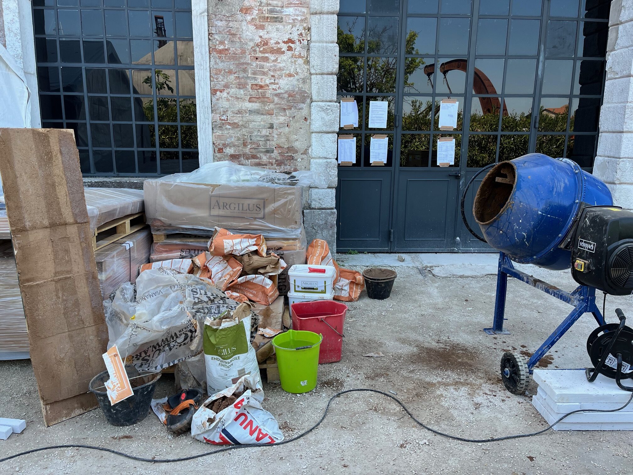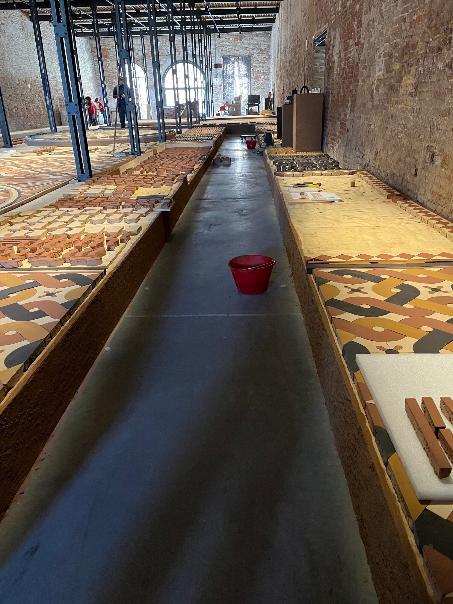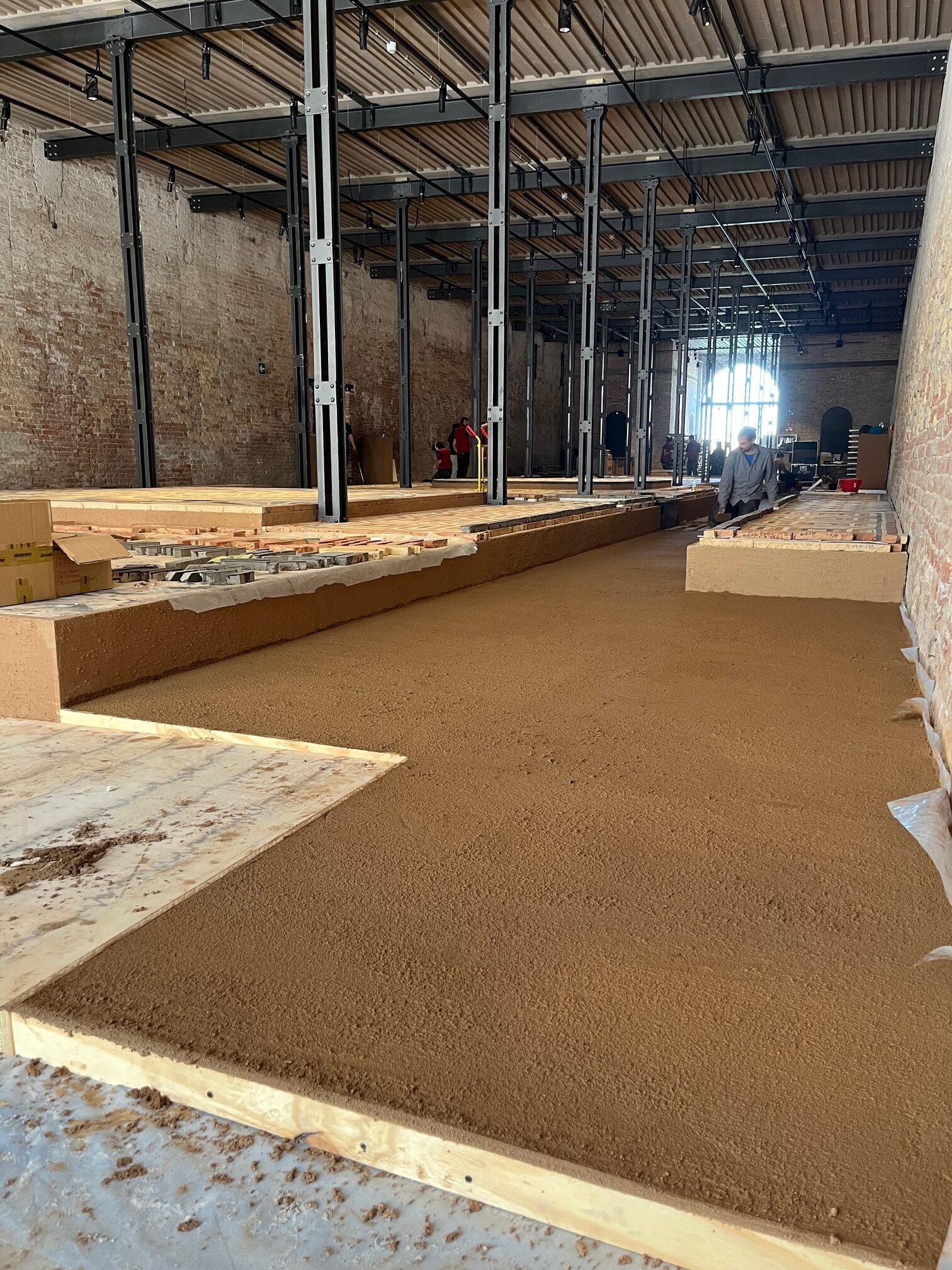 V to zakulisje sta nas lani povabila Claudia Ortigas in Mateo Eiletz iz studia eiletz ortigas s povabilom k izdelavi obsežnih elementov iz zbite zemje. Bienale se nam je odprl kot zapleten organizem, ki pred odprtjem diha skozi gradbišča, dostave, sestanke, zamude, orodja, roke in materiale.